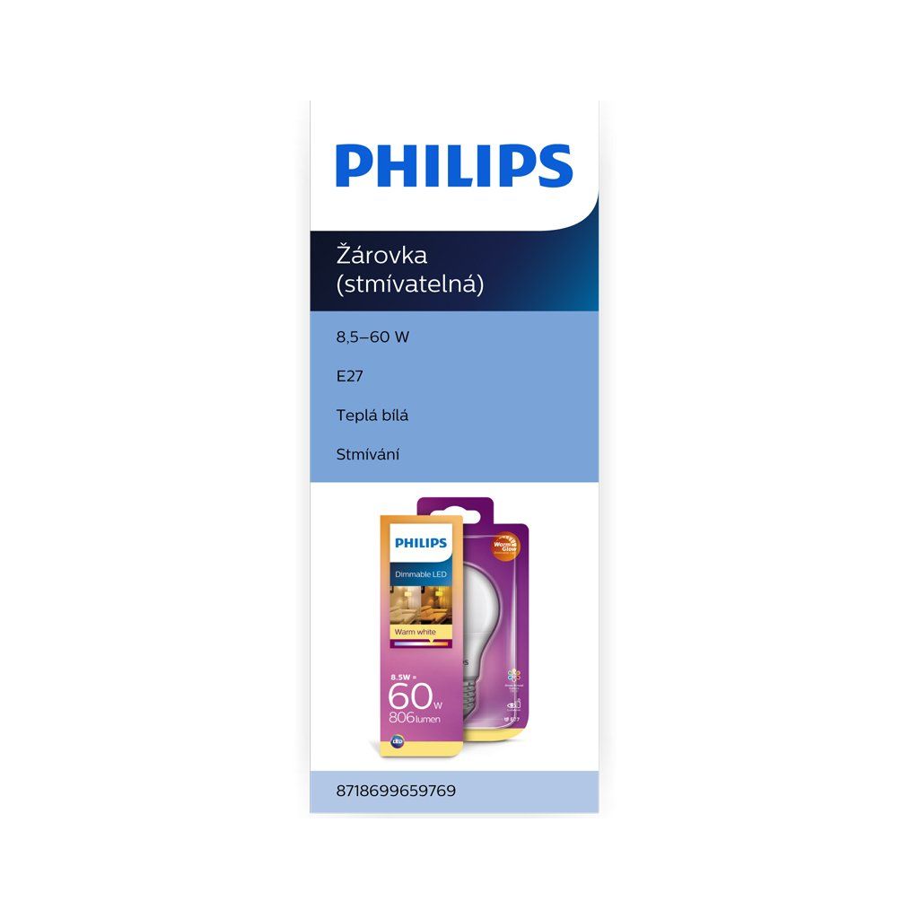 Philips LED žárovka E27 A60 8,5W 60W teplá bílá 2700K stmívatelná (9769)
