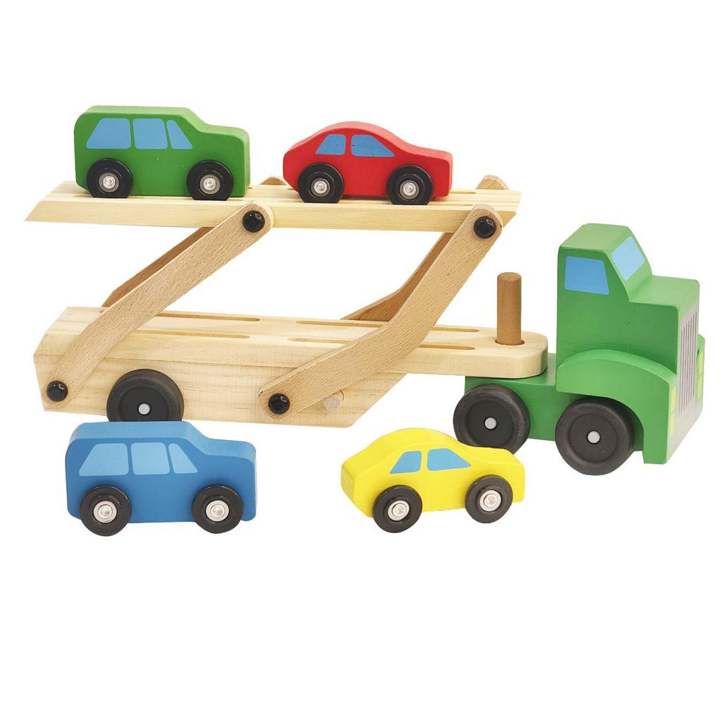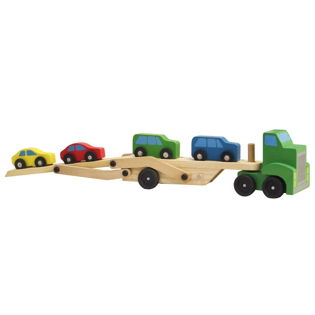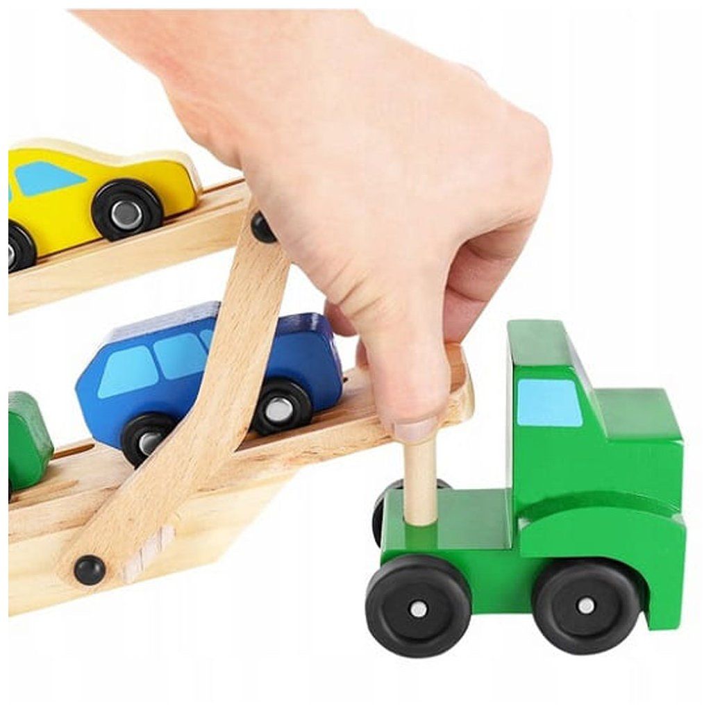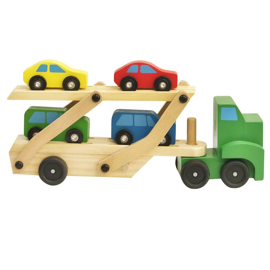Dřevěný kamion je vyrobený z kvalitního dřeva. Tahač má odjímatelný návěs a na něj se dají postavit čtyři auta, která jsou součástí balení. Celková délka kamionu je 32 centimetrů. Návěs je sklápěcí a můžete tak snadno vytvořit nájezd pro auta, nebo vytvořit rovný prostor na návěsu pro všechna čtyři autíčka.