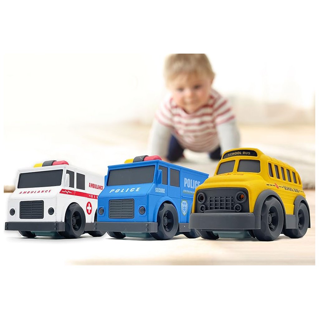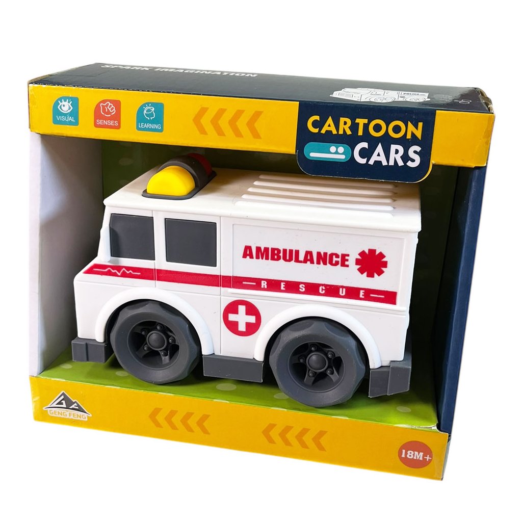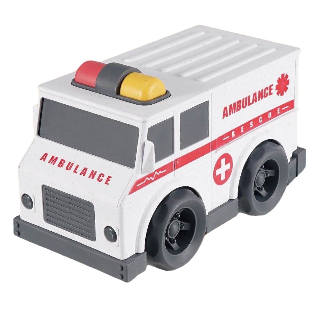 Plastové autíčko z bioplastu na setrvačník. Autíčko je velké 15 centimetrů a jezdí na setrvačník.