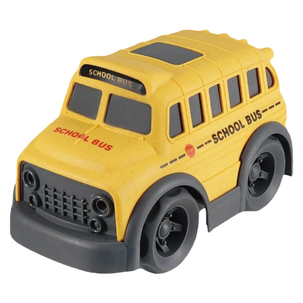 Plastové autíčko z bioplastu na setrvačník. Autíčko je velké 15 centimetrů a jezdí na setrvačník.