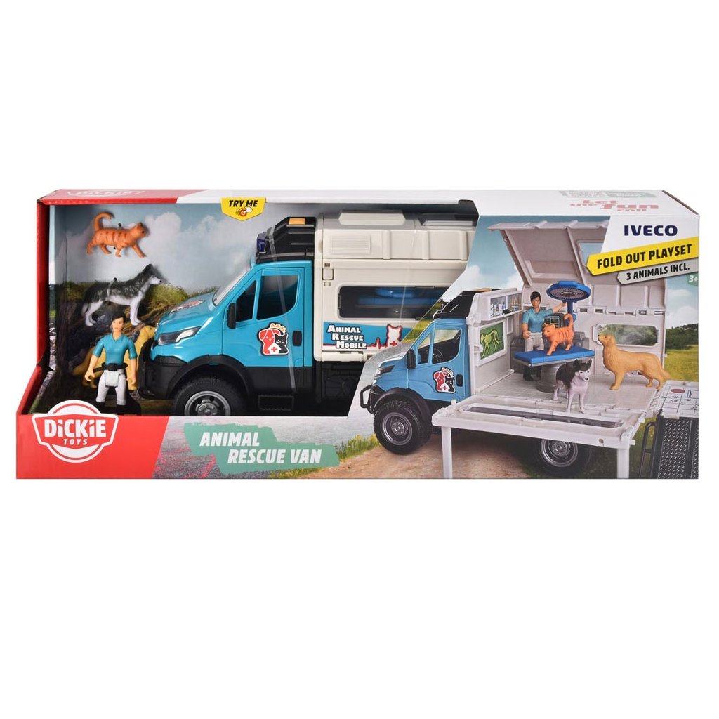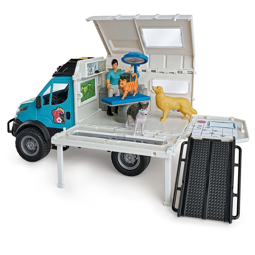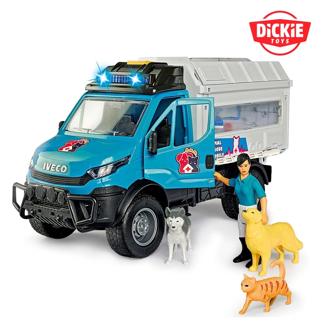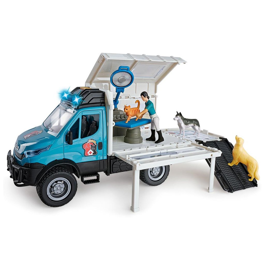 Pojízdná veterinární ambulance IVECO se zvukovými a světelnými efekty. Rozlož si pojízdnou ambulanci, rozlož si stůl, který se otáčí, ordinační lampu a začni vyšetřovat. Balení obsahuje ohebnou figurku, 2 pejsky, 1 kočku a příslušenství.
