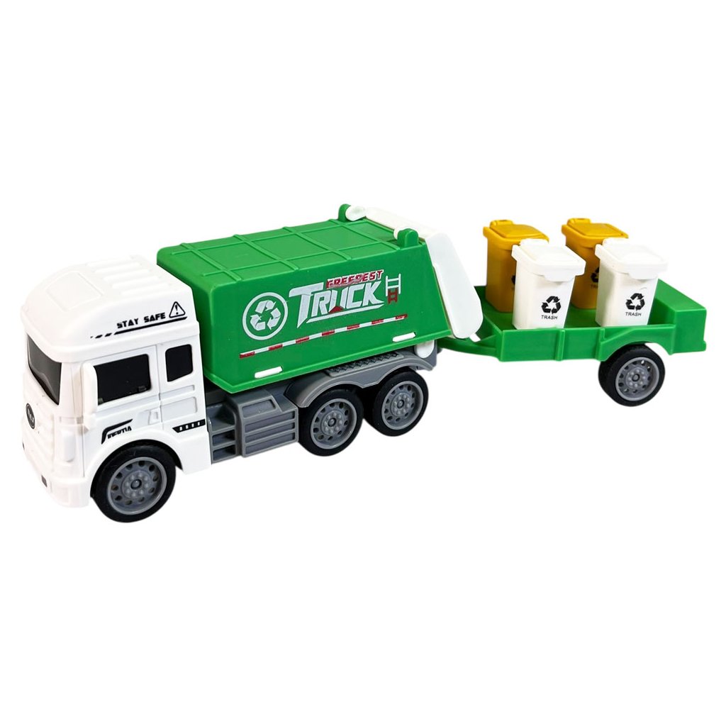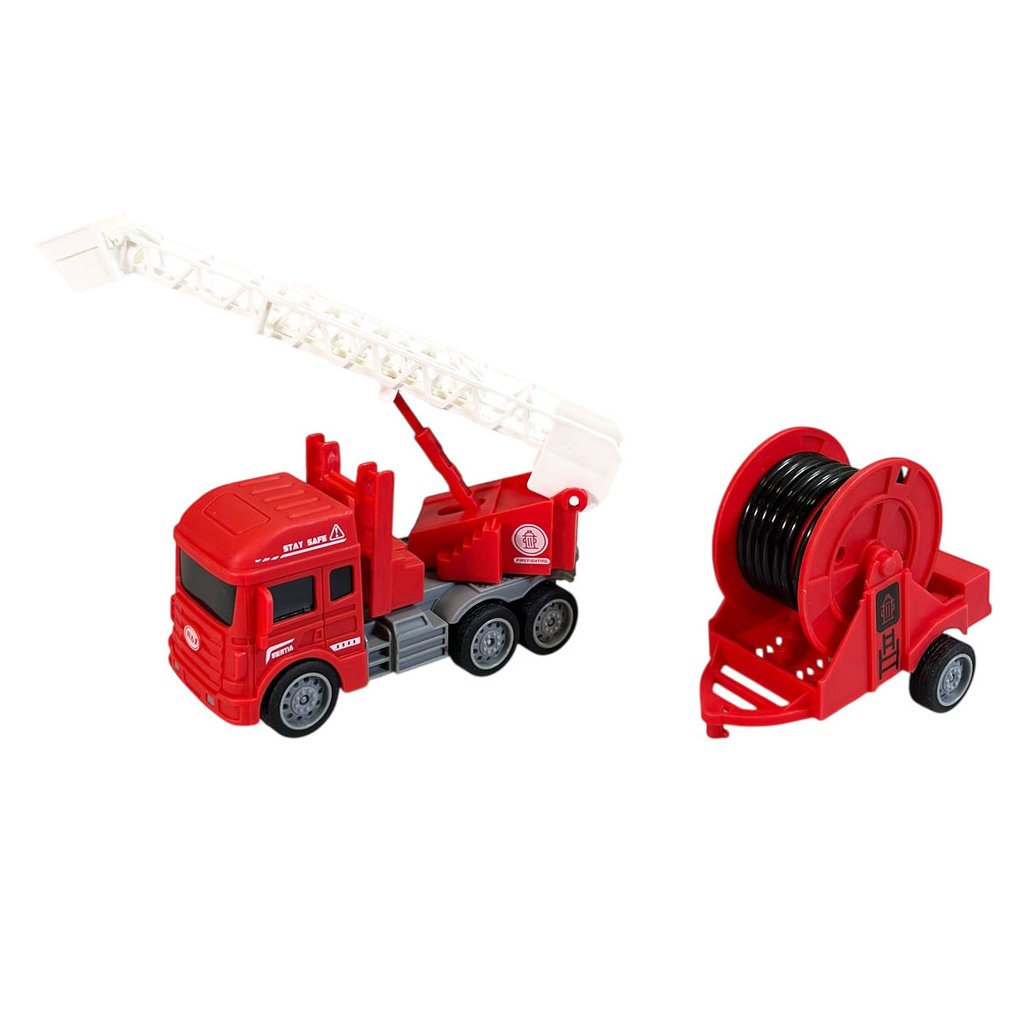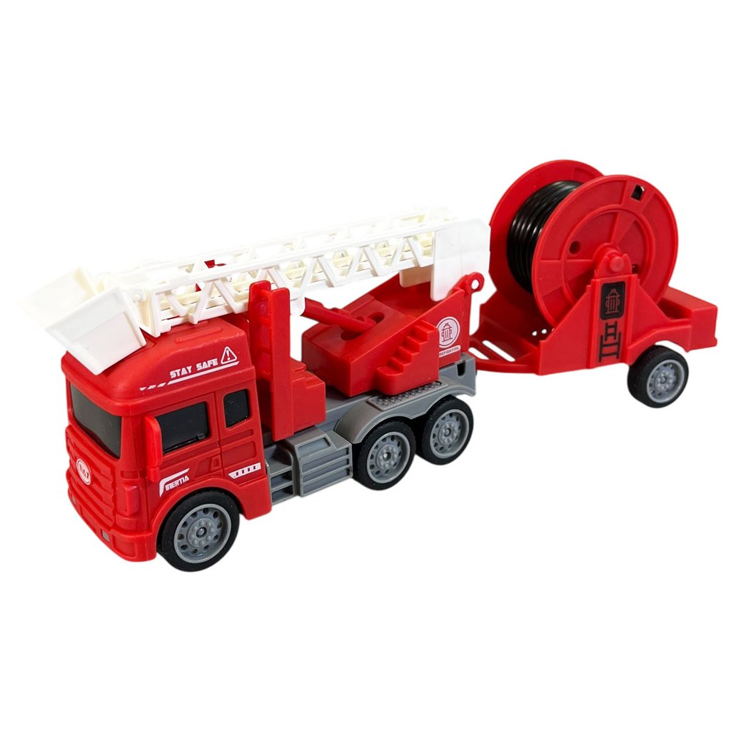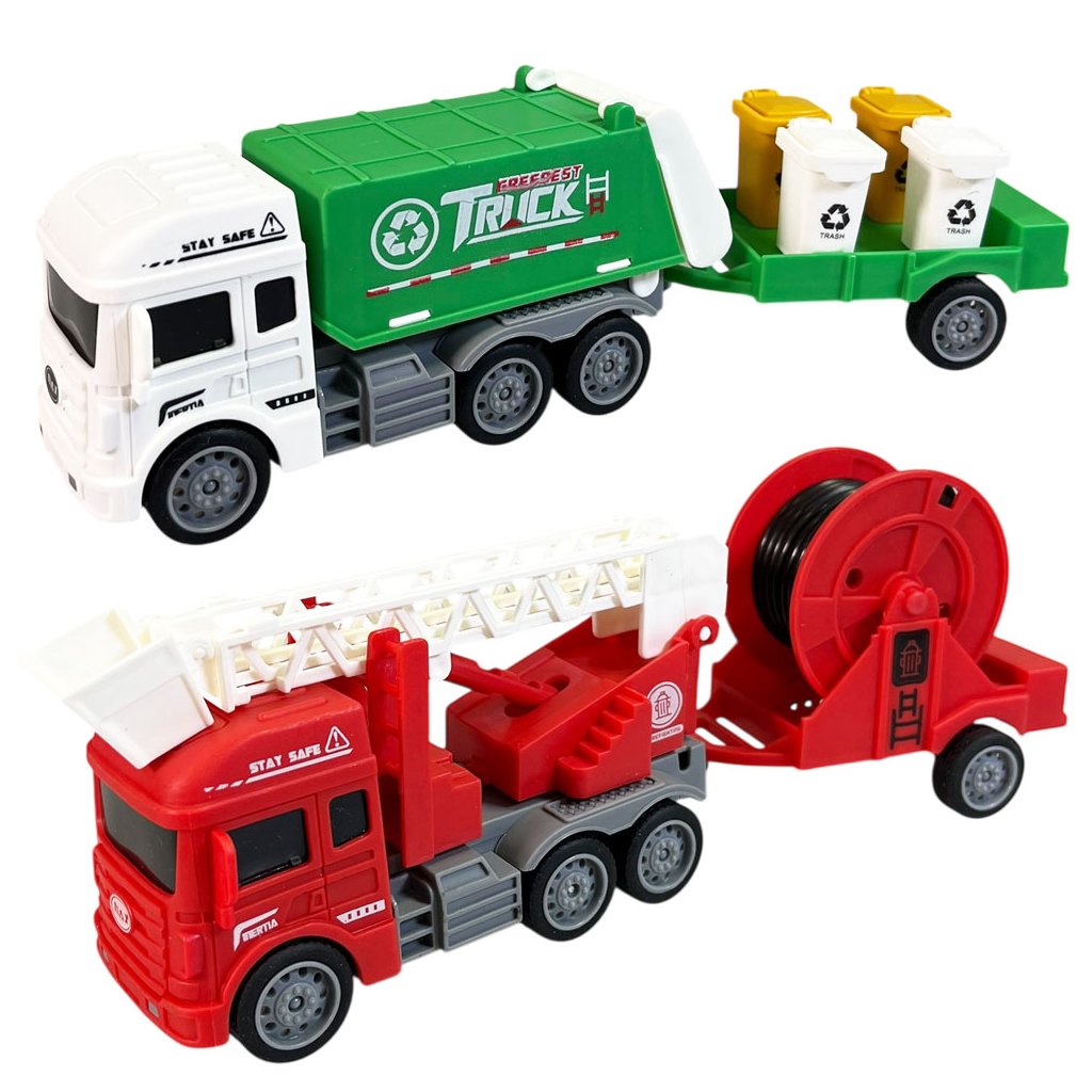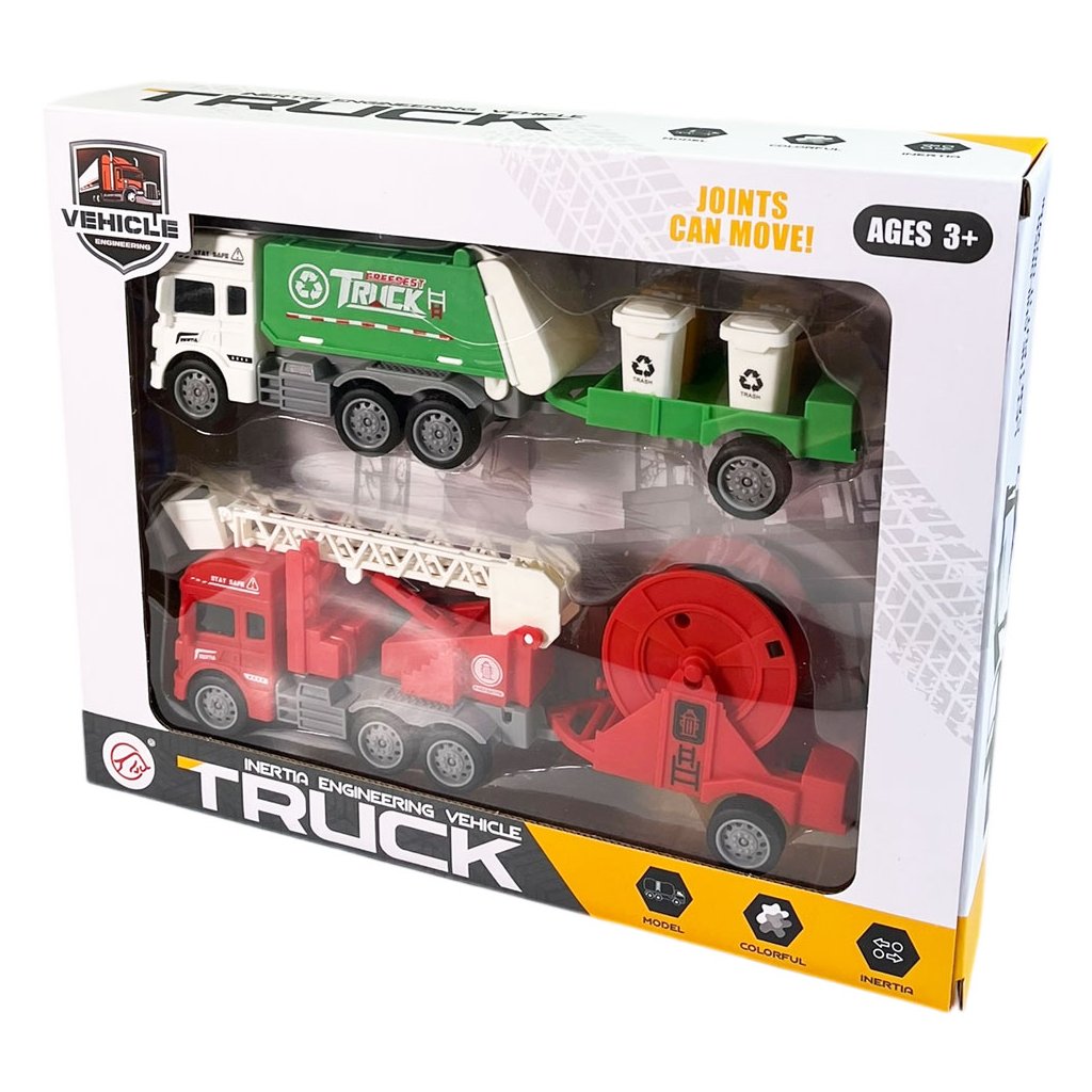 Parádní sada dvou autíček s přívěsy a doplňky. Hasičské i popelářské auto mají odjímatelné přívěsy. Hasičské auto může otáčet a nastavovat žebřík. Popelářské auto má sklopný úložný prostor. Přívěs popelářského auta obsahuje čtyři popelnice, které jsou otevíratelné. Obě autíčka jezdí na setrvačník.