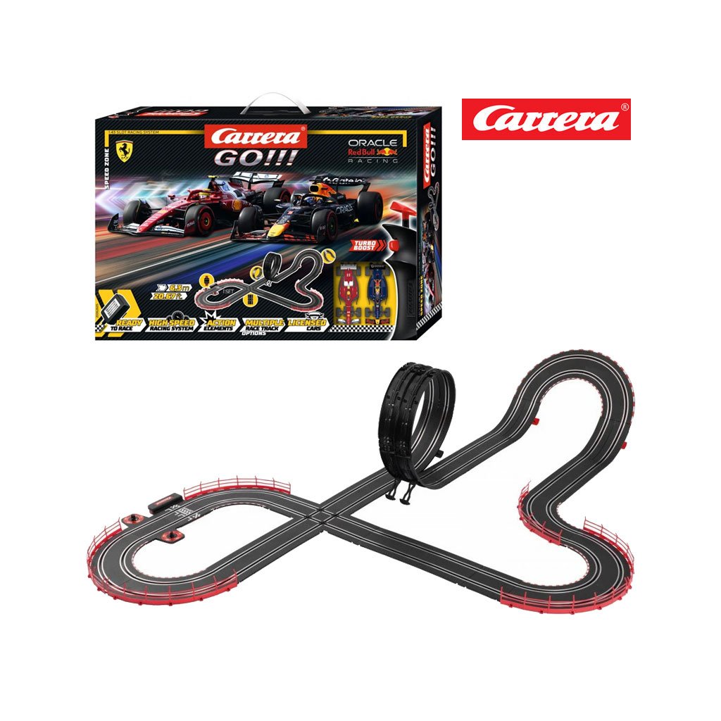 Autodráha Carrera GO!!! dlouhá 6,3m s auty F1 Red Bull a Ferrari, obsahuje, křižovatku, rovinky, zatáčky, kolmou stěnu, looping, díl s počítadlem kol a další díly. Můžete si sestavit další různé trati podle své fantazie.