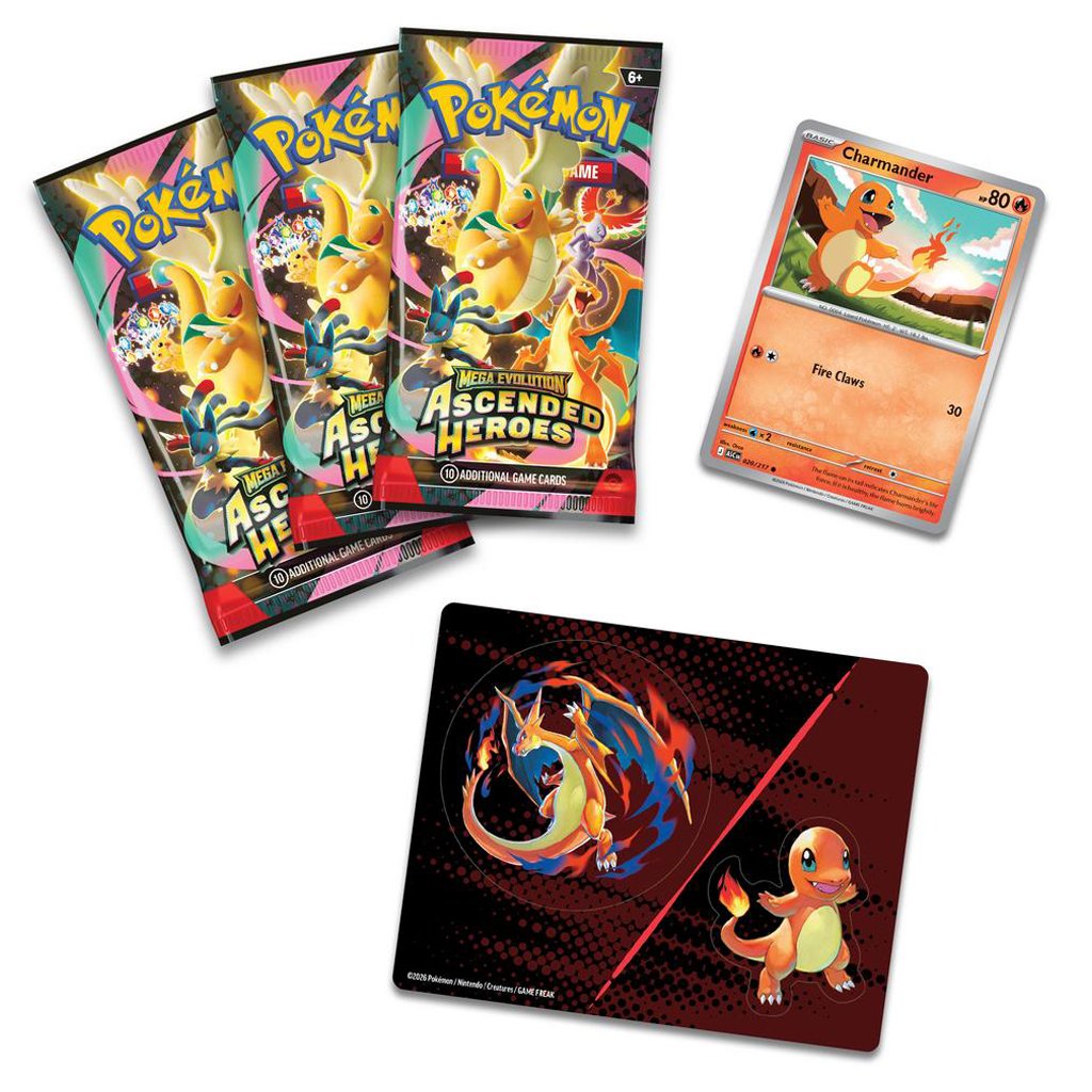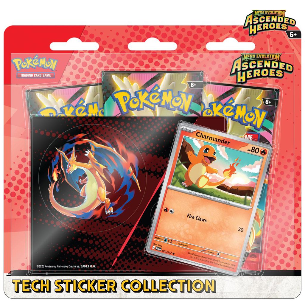 Pokémon Ascended Heroes Tech Sticker Collection - Charmander obsahuje 3 booster balíčky Pokémon karet, samolepku a jednu promo kartu.