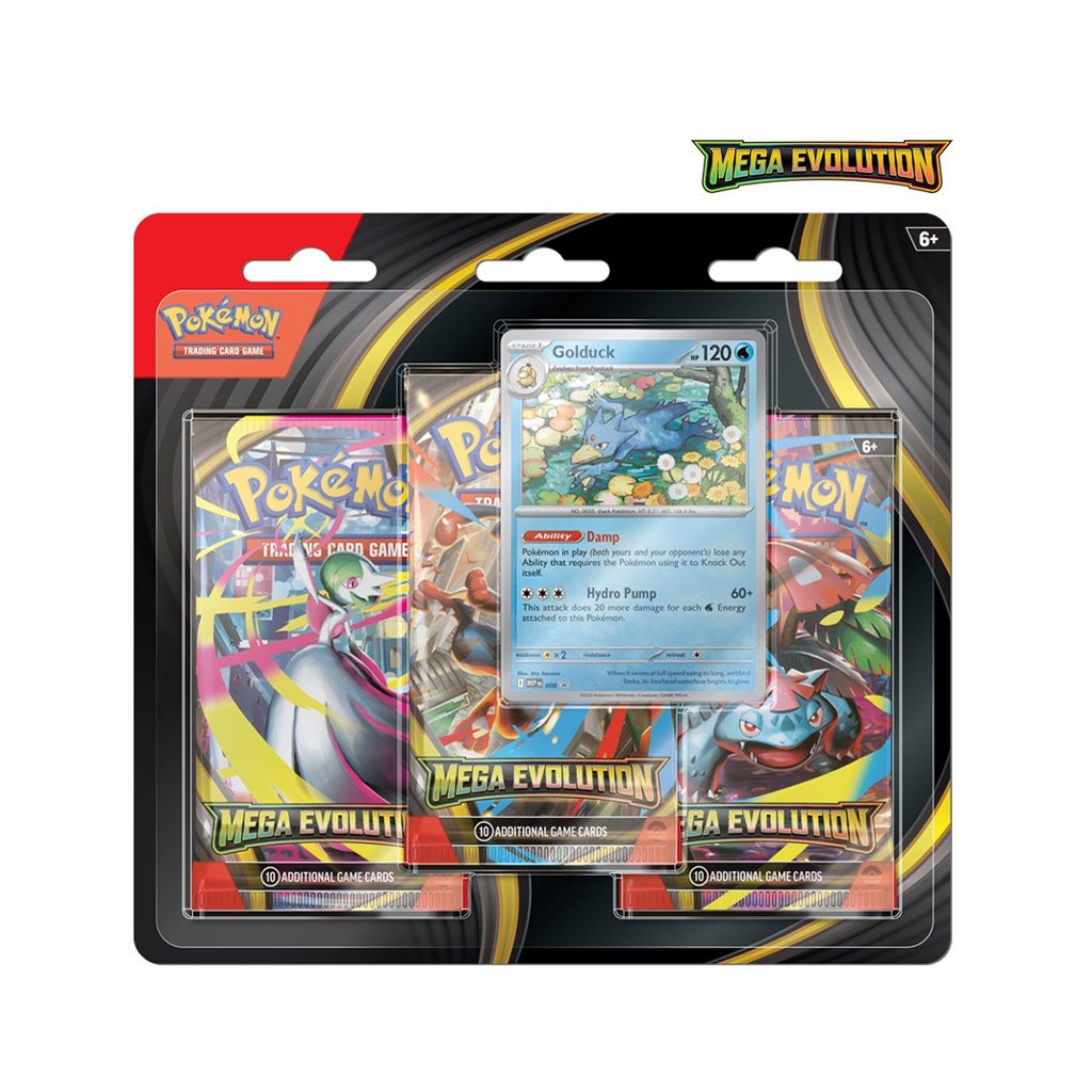 Mega Evolution 3-Pack Blister - Golduck je balení 3 balíčků a jedné promo karty! Tento balíček je perfektní volbou pro nadšené sběratele, tak i hráče Pokémon TCG. Vše k rozšíření vaší sbírky.