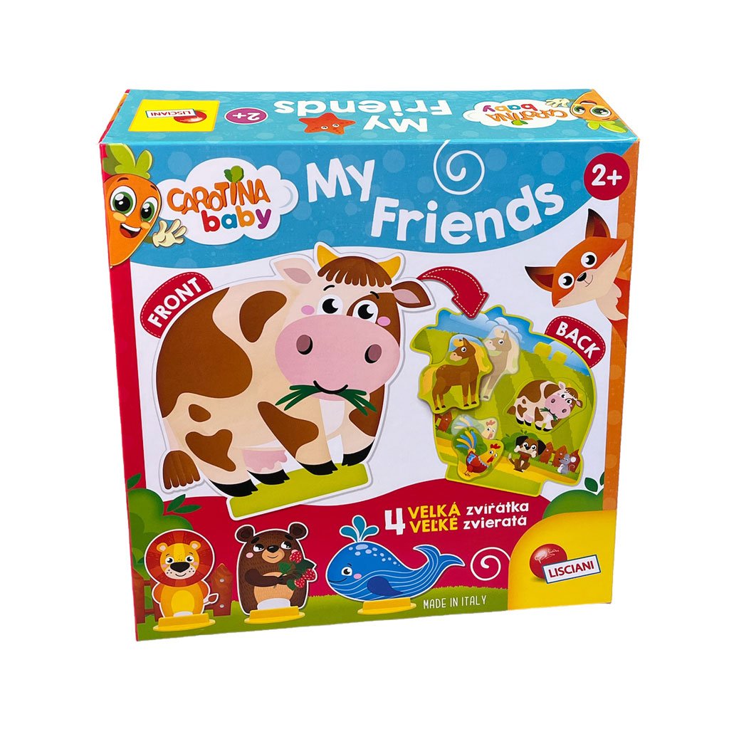 Moji zvířecí kamarádi jsou novým přírůstkem do série Carotina Baby. Výrobek obsahuje 4 zvířata, která jsou zároveň typickými představiteli prostředí, které je obývají - velryba, lev, medvěd a kráva. Ke každému z nich je třeba přiřadit malá zvířata, která se hodí do daného prostředí. Každé velké zvíře má svůj stojánek, aby se dítě mohlo zvířátko zařadit. Zábava vám umožní poznávat zvířata a cvičit uchopování. Prvky jsou vyrobeny z odolného kartonu, který hravě s dětmi přežije.