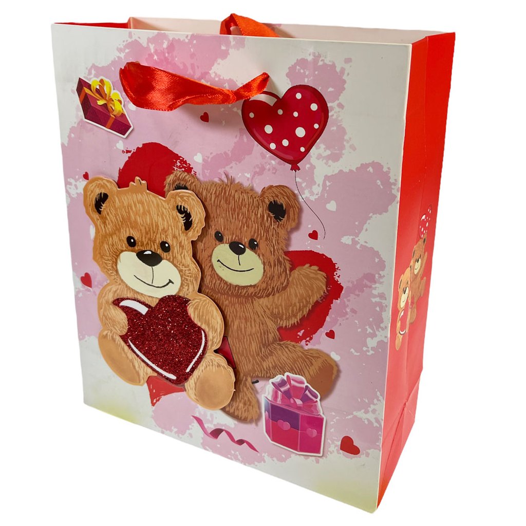 Taška je vyrobena z velmi pevného papíru, má vyztužené dno, ouška ze stuhy o šíři 2 centimetry. Dárková taška je s motivem medvídka se třpytkami.