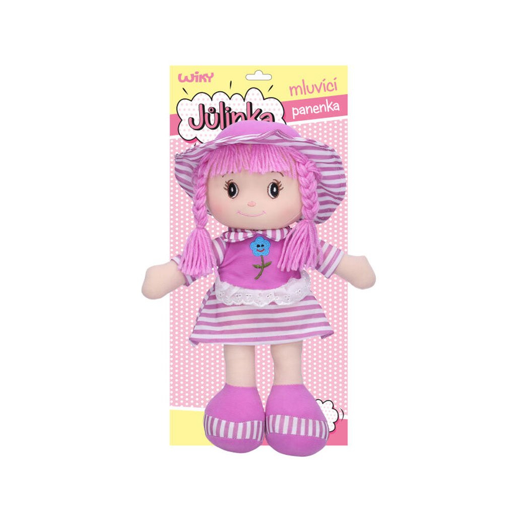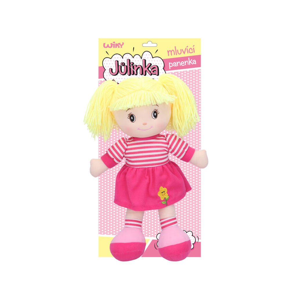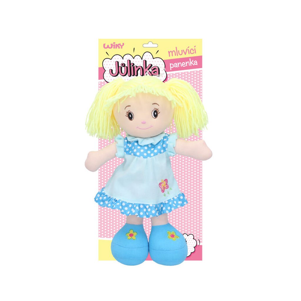 Ahoj, já jsem tvoje panenka Jůlinka. Budeme si spolu hrát celý den a naučíme se spoustu říkanek! Stačí stlačit bříško a povím Ti 4 české říkanky! Panenka Jůlinka bude tvou novou kamarádkou, se kterou se naučíš nejznámější písničky a užiješ legraci! Tak kterou si vybereš? Látkovou panenku s roztomilým obličejem, velkými kukadly, krásnými šatičkami a vlásky z vlny si oblíbí všechny malé slečny! Díky měkkému tělíčku i hlavičce může být kamarádkou nejen při hraní, ale také při usínání! Říkanky: Dobré ráno, dobrý den,... Nachystáme tělíčko, zacvičíme maličko... Jedna lžička za babičku, jedna lžička za tátu,... Na nebi jsou světýlka, už tě čeká postýlka,..