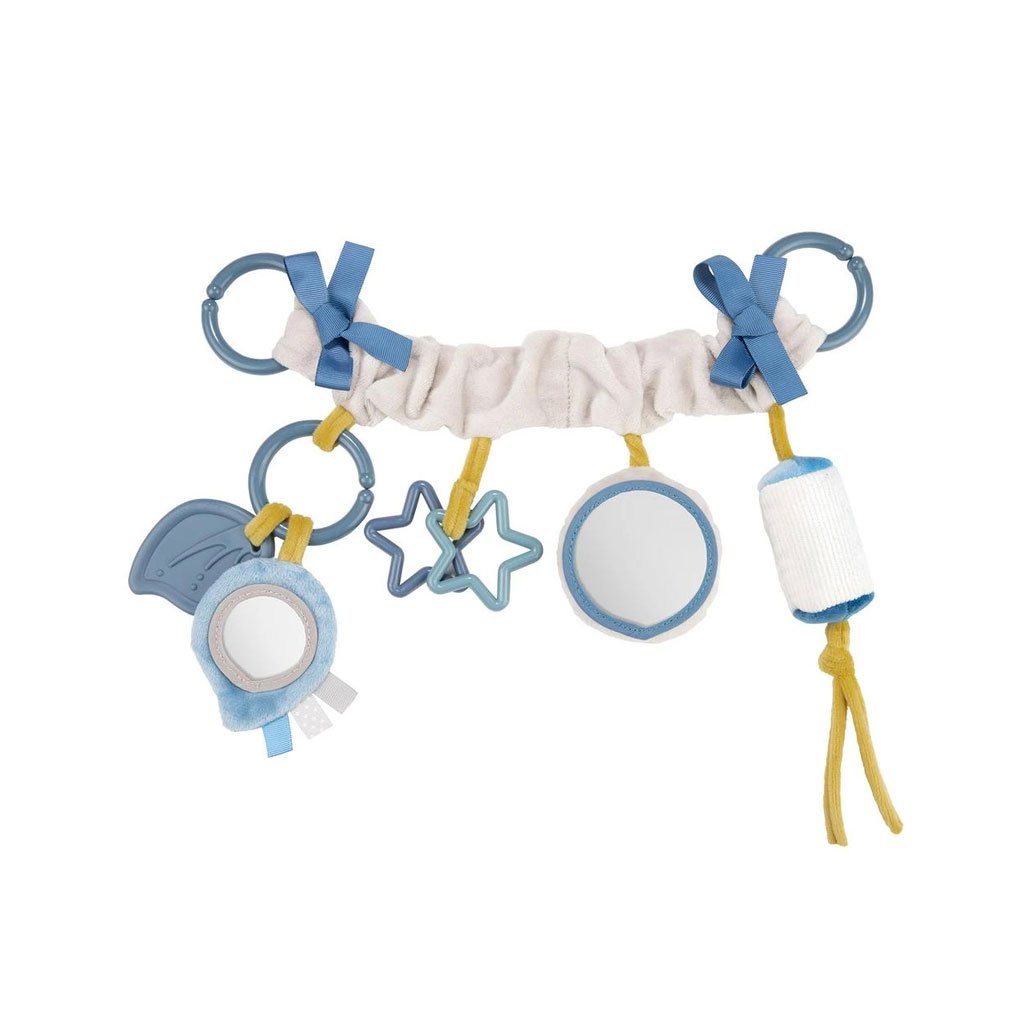 Zvonění a šustění materiálů upoutává dětskou pozornost. Vícebarevné stuhy povzbuzují dítě, aby je chytilo. Elastická kousátka zklidňují dásně dítěte při růstu zoubků.