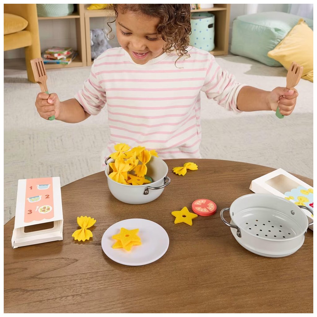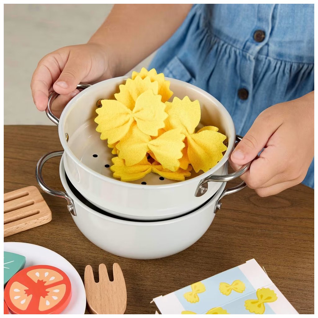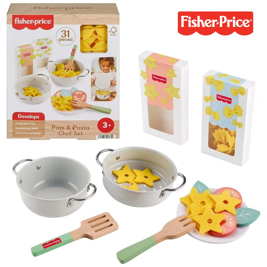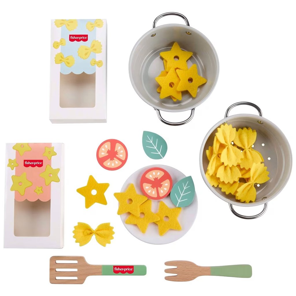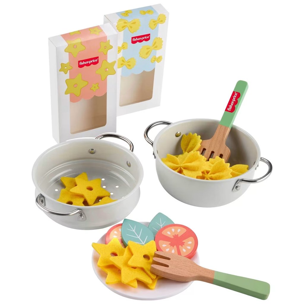 Malí kuchaři mohou říct „bon appetit“ a naservírovat jídlo tímto herním setem od Fisher-Price. Děti si mohou uvařit a podávat hostinu s těstovinami „al dente“ díky této sadě s 31 kusy, která obsahuje dřevěné kuchyňské náčiní a ingredience, stohovatelné kovové hrnce a látkové těstoviny ve dvou různých tvarech.