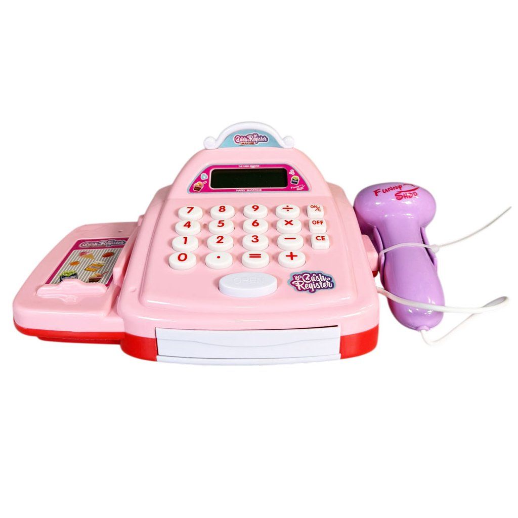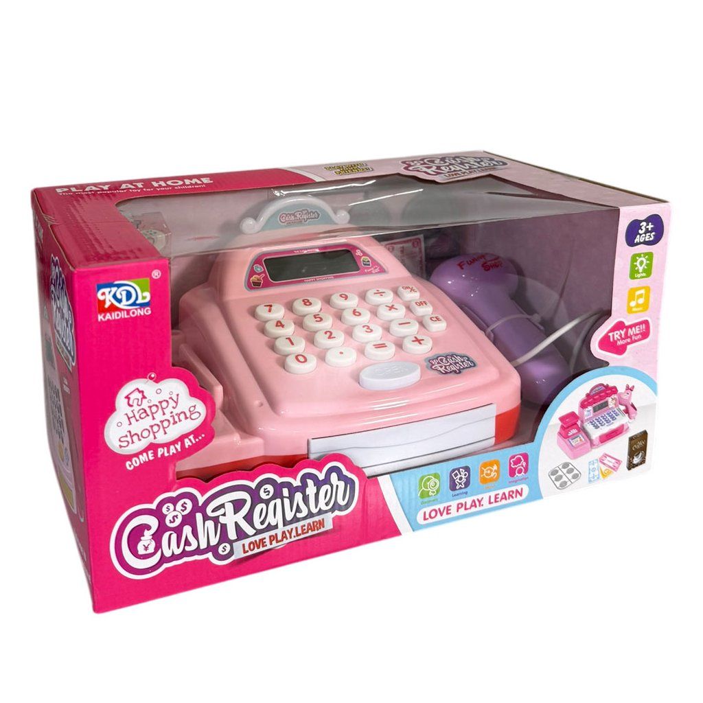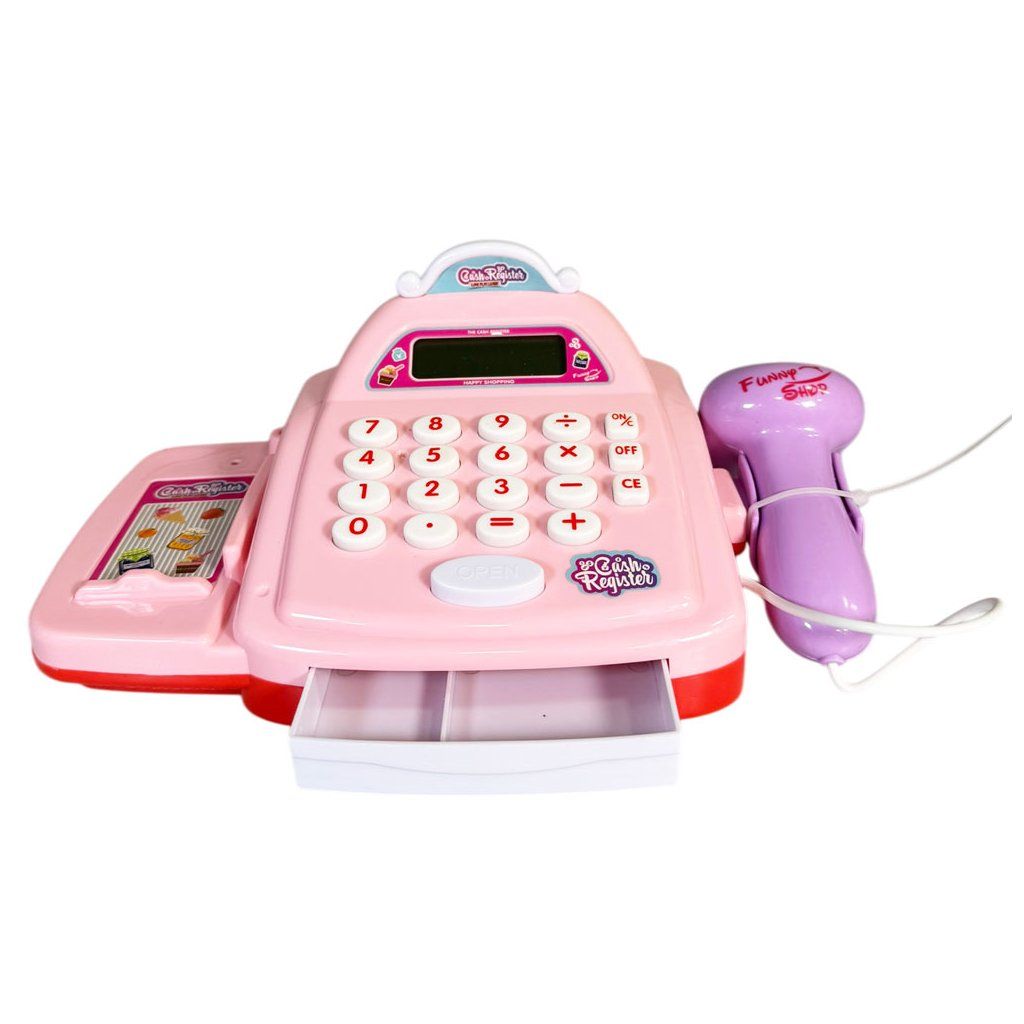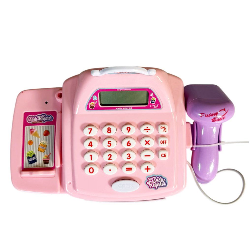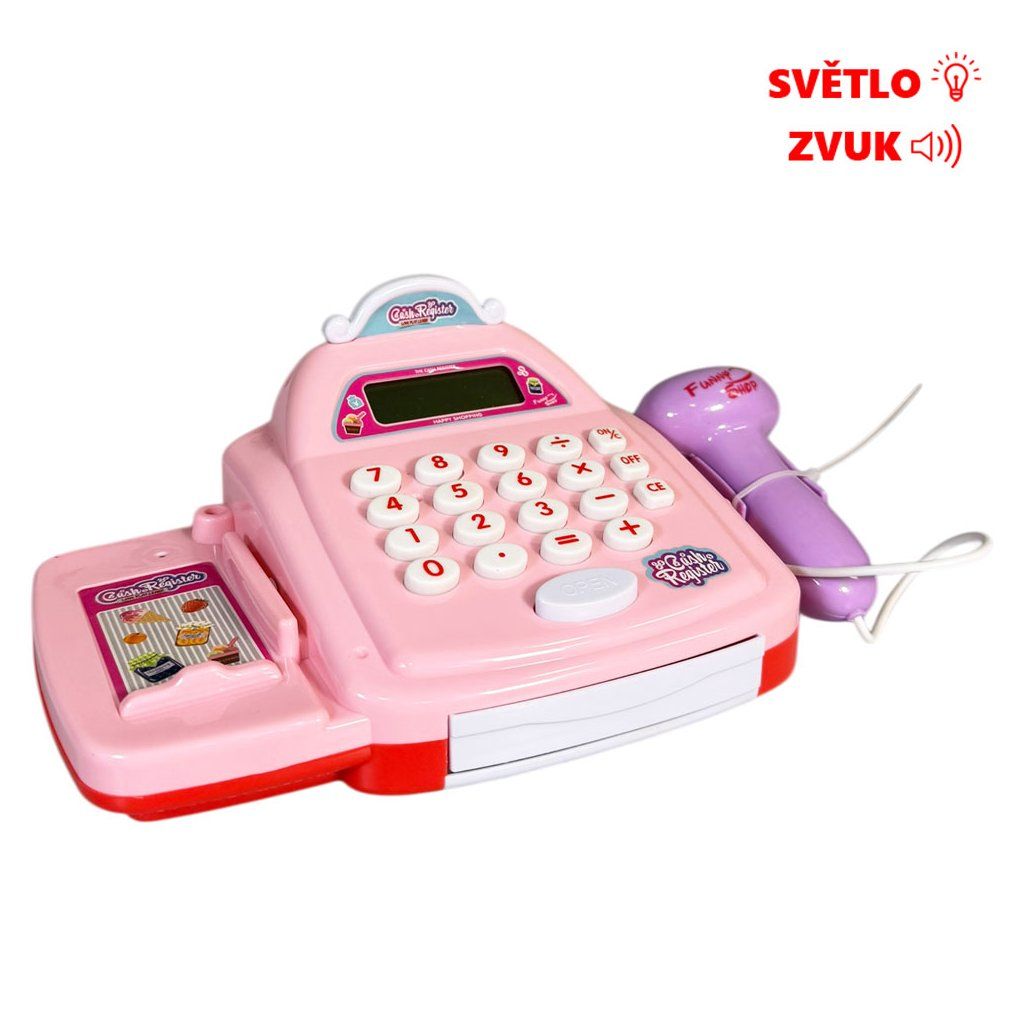 Dětská elektronická pokladna s doplňky pro každý správný obchod. Funkční kalkulačka s displejem, otevírací zásuvkou s penězi a světlem a zvukem u čtečky čárových kódů.