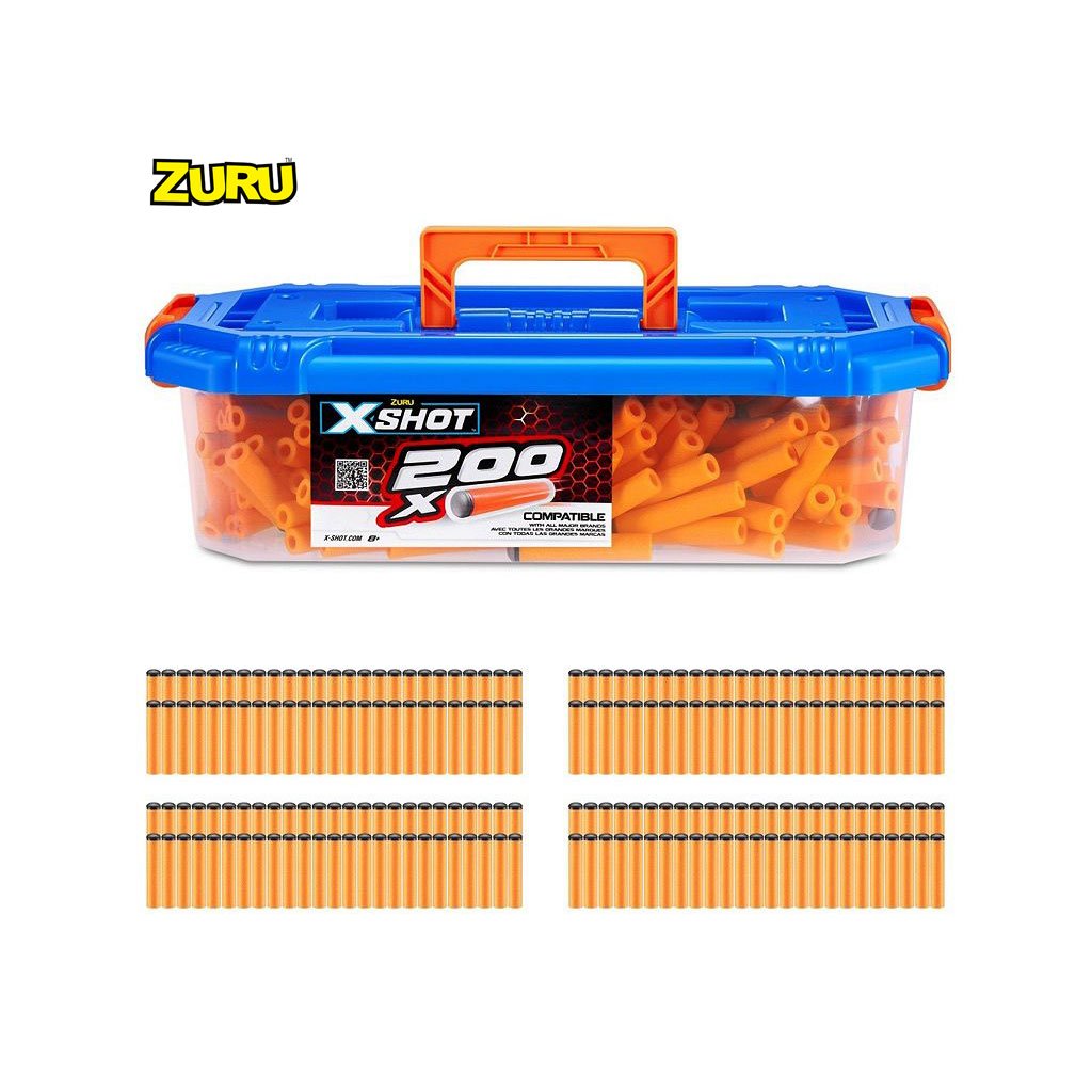 Pěnové náboje do zbraní X-Shot. Pěnové náboje jsou uloženy v praktickém kufříku pro uskladnění a snadné přenášení. V balení se nachází 200 ks. Náboje jsou kompatibilní s hlavními značkami zbraní včetně Nerf.