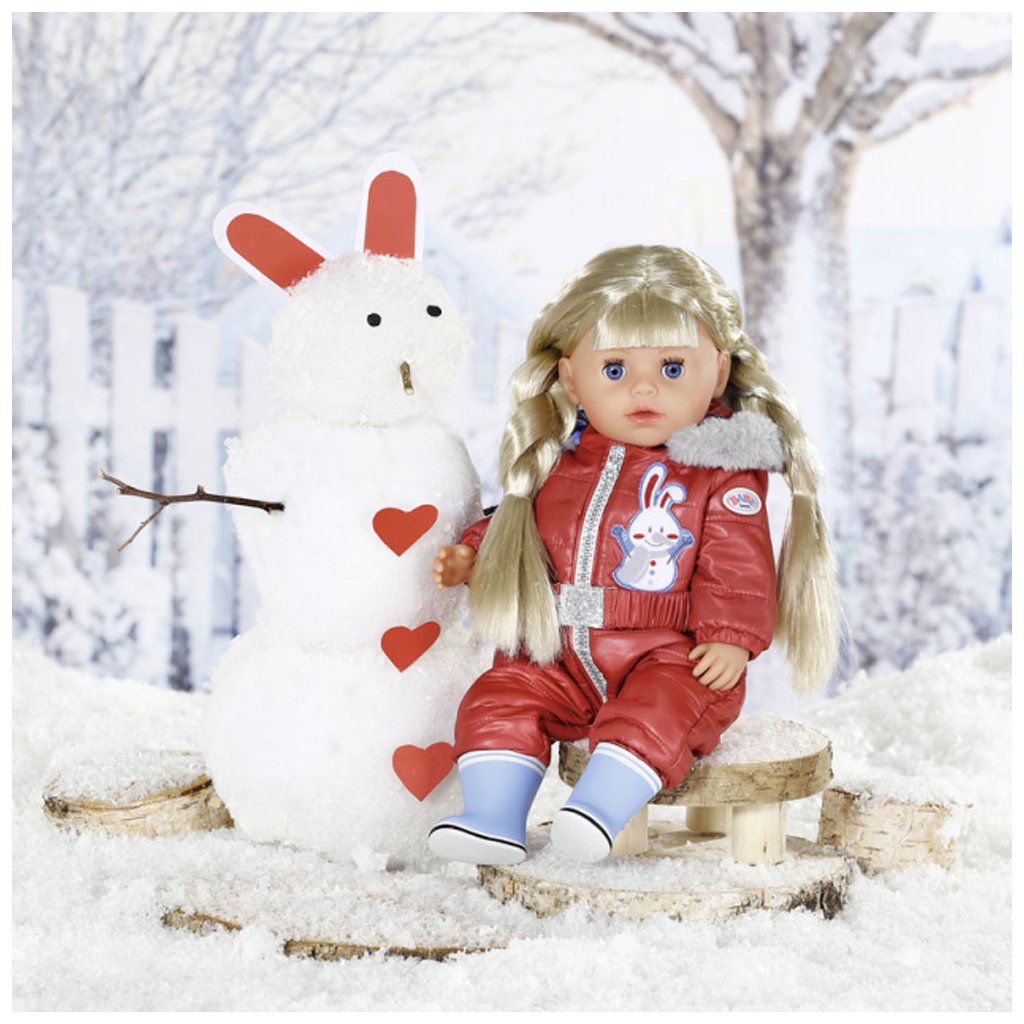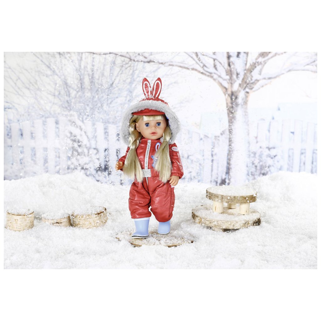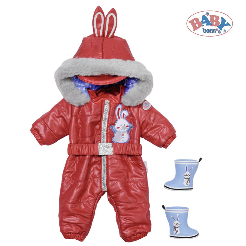 Krásnou kombinézu ocení panenka BABY born Little zejména v zimním období při radovánkách na sněhu. Zimní kombinéza je ozdobena na kapuci roztomilými oušky a na přední straně je obrázek zajíčka. Je zde také našitý kšilt a kožíšek. Tuto soupravu doplňují zimní botičky v modré barvě.