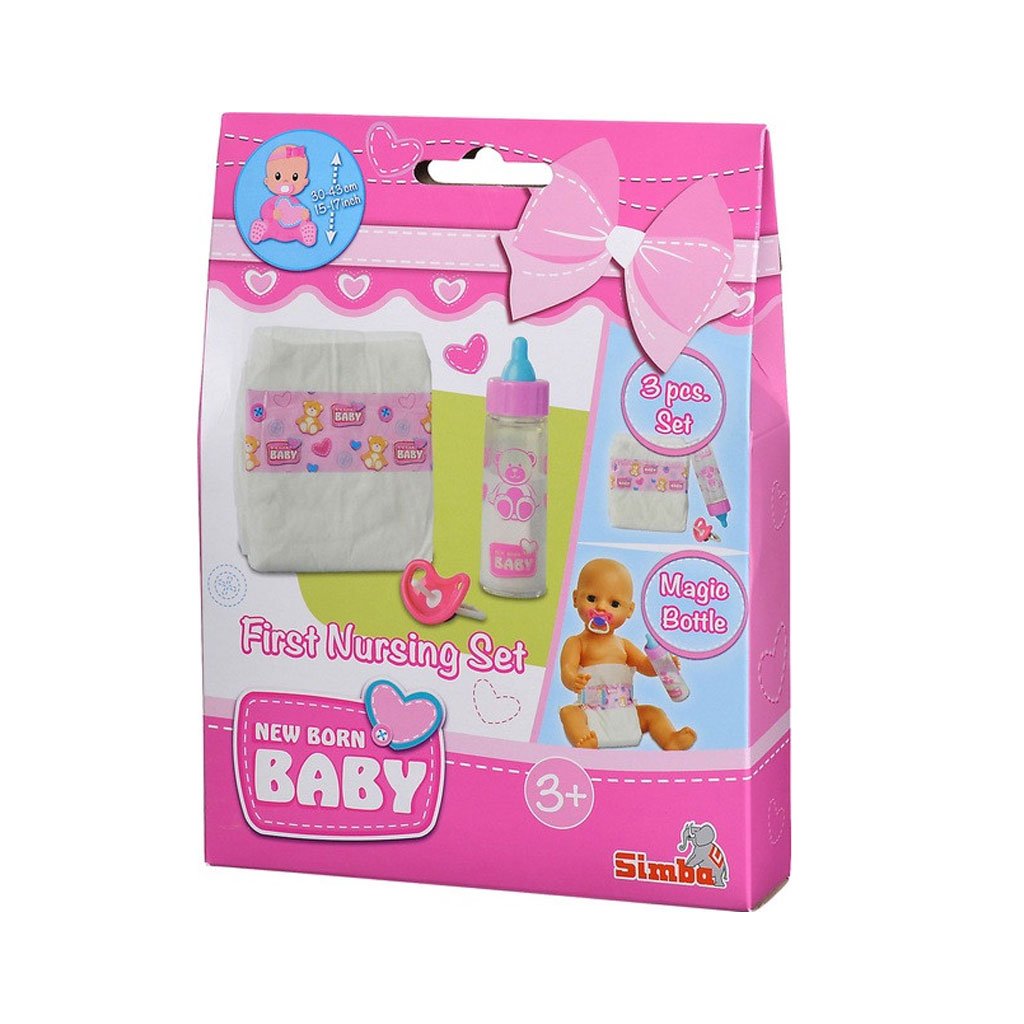 Sada pro miminka z řady New Born Baby obsahuje dudlík, plenku a lahvičku s mlékem (mizící efekt při pití). Vhodné pro panenky velikosti 38–43 cm.