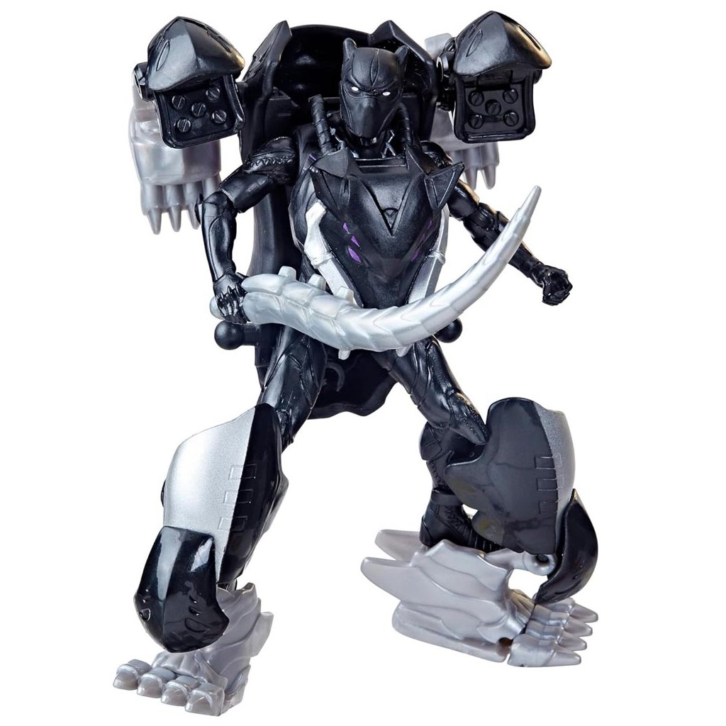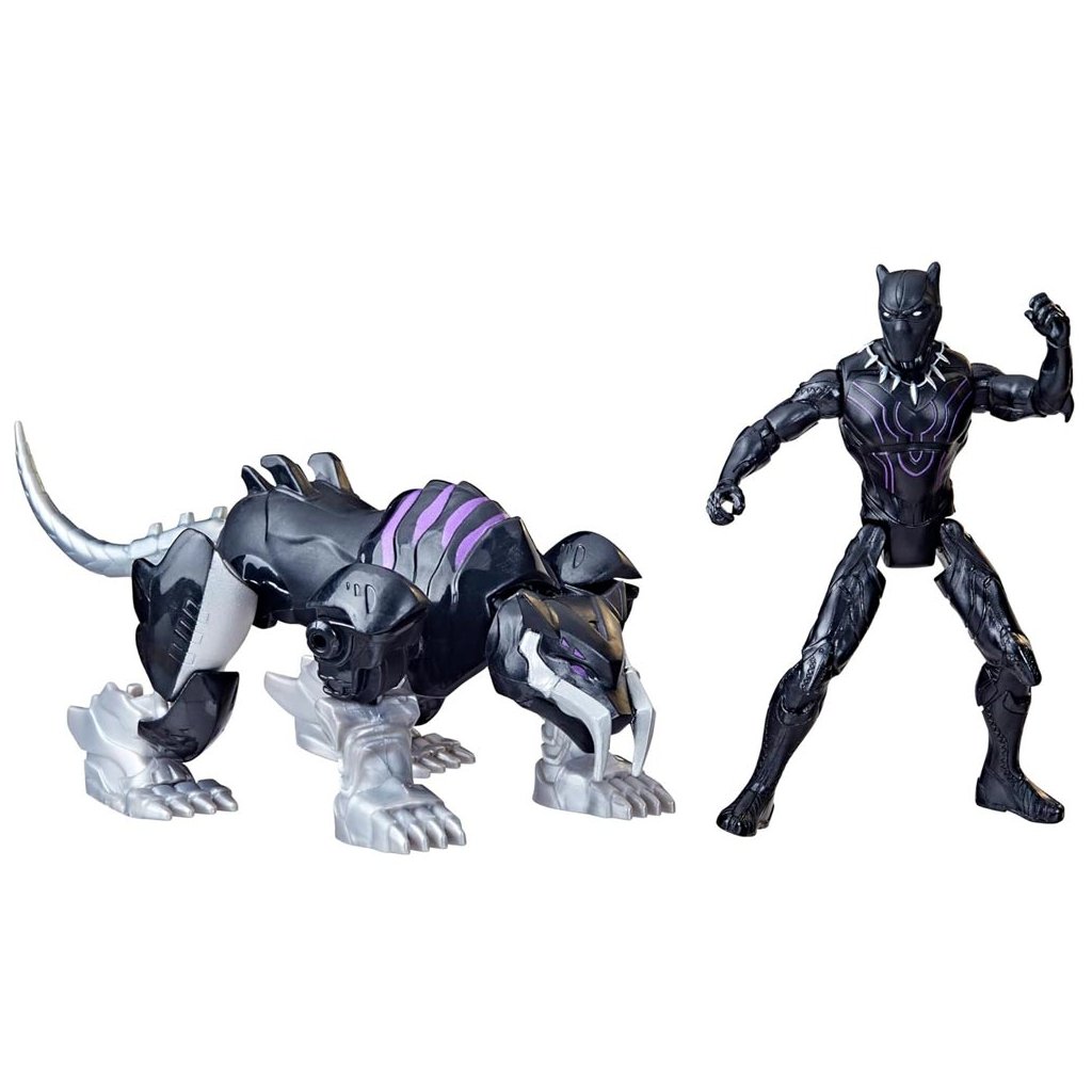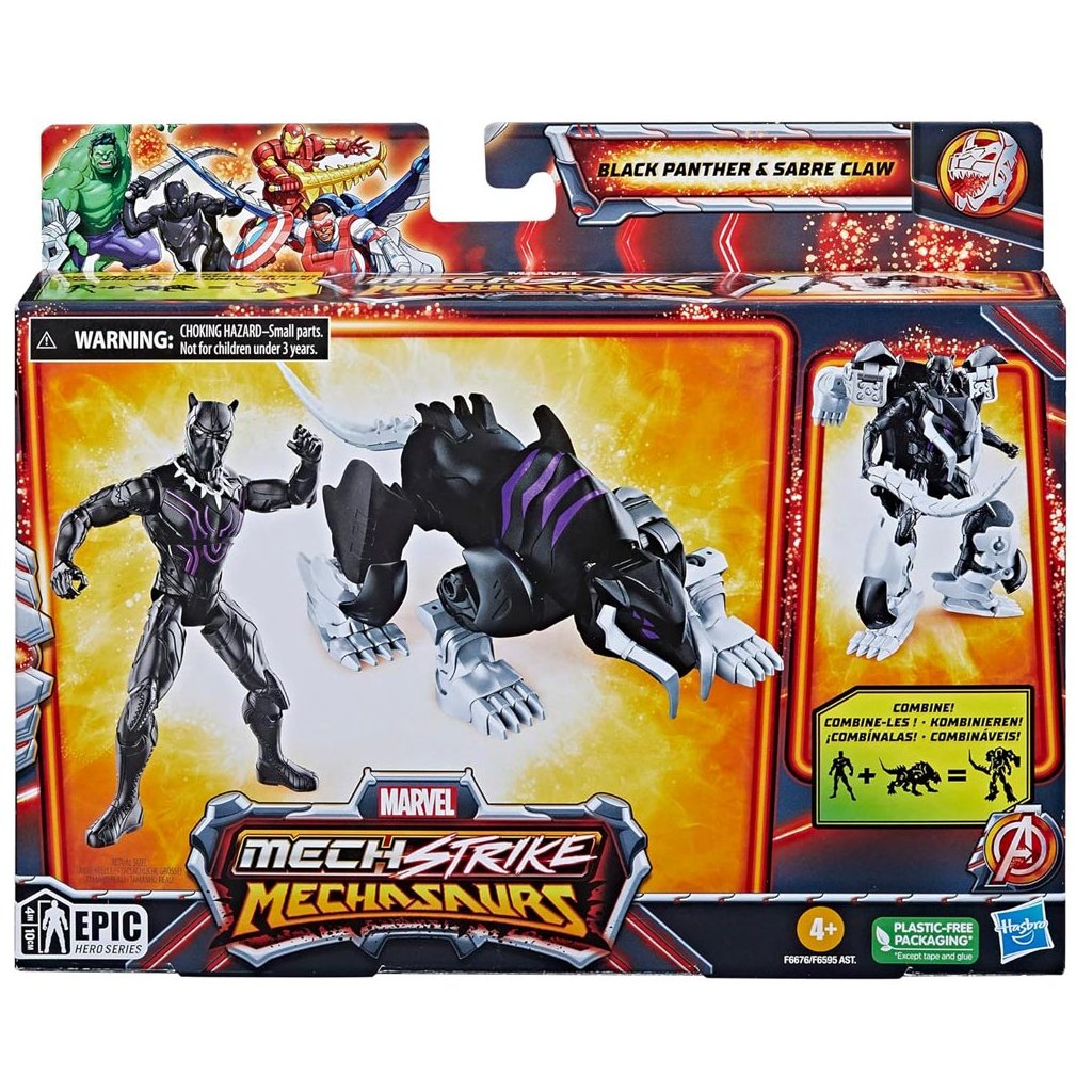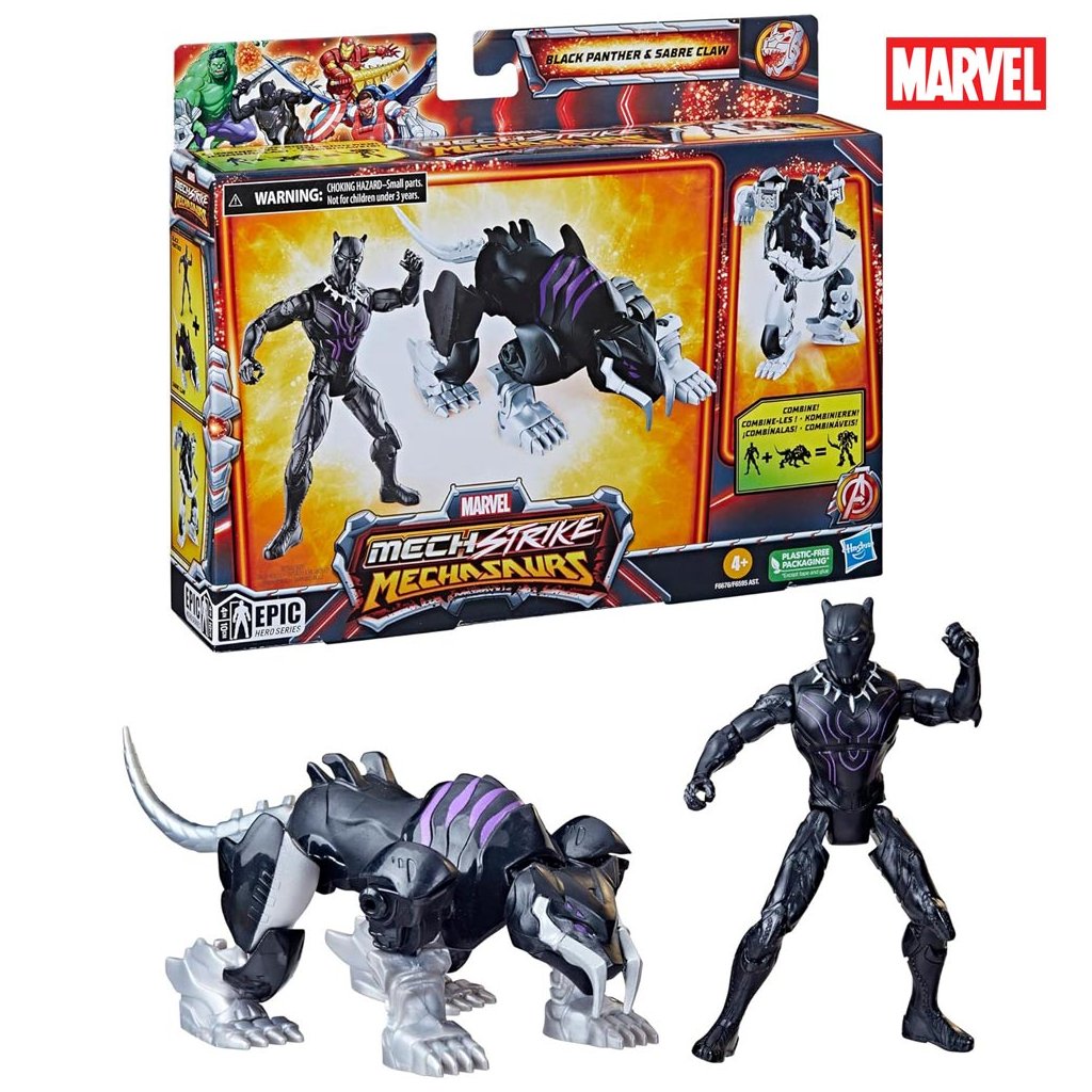 Figurka Marvel Mech Strike Black Panther a Sabre Claw. Každá 10 cm akční figurka Marvel má Mechasaura, kterého lze rozebrat a postavit si obrněný oblek, obsahuje i odnímatelný blaster s projektilem, pohyblivé končetiny. Akční figurka superhrdiny má 9 možností nastavení, takže děti mohou předstírat, že s ní bojují nápaditými způsoby.