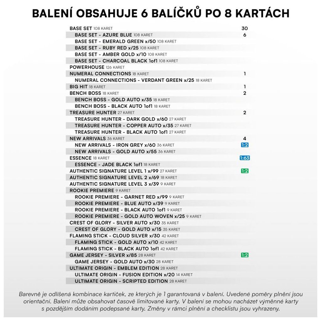 Součástí Blaster balíčku Tipsport ELH 2025/26 je 5 kartiček základního setu, 1 karta paralelní verze základního setu Azure Blue a 2 speciální insertní karty, kterými mohou být: