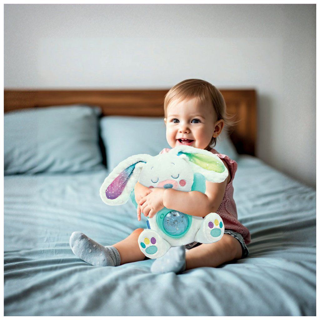 Hlasitost a časovač lze snadno nastavit. Měkoučký plyšový králíček je bezpečným a útulným společníkem pro miminka již od narození. Plyš lze po vyjmutí elektronického modulu vyprat.