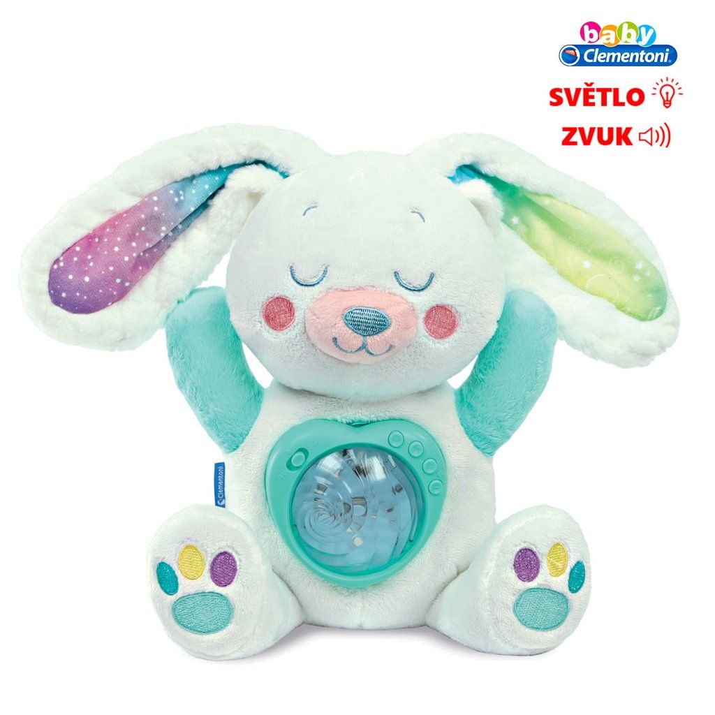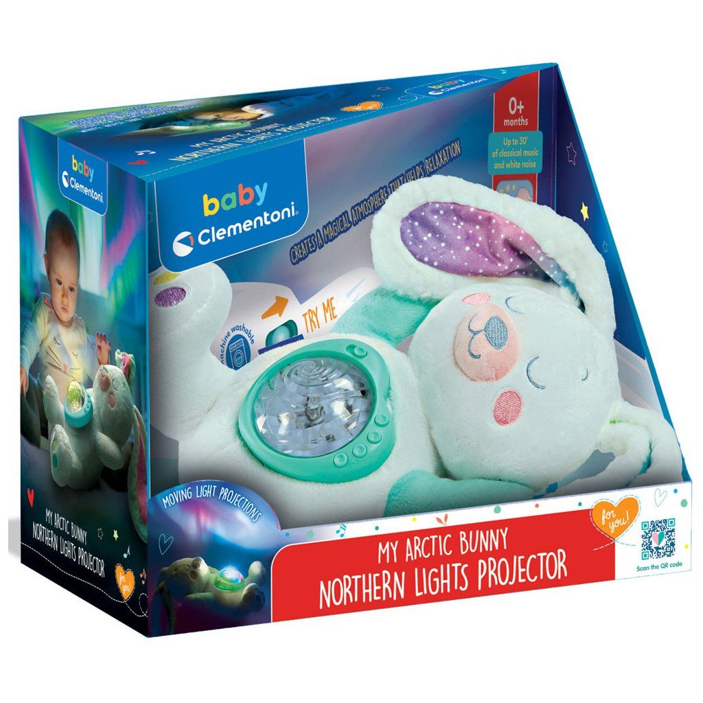 Plyšový arktický králíček od Clementoni Baby vytváří uklidňující atmosféru před spaním tím, že promítá na strop krásnou polární záři. Vestavěný elektronický modul nabízí až 10 různých barev světla, které lze podle potřeby nastavit. Kromě toho roztomilý králíček hraje klasickou hudbu, ukolébavky, přírodní zvuky a bílý šum po dobu až 20 minut.