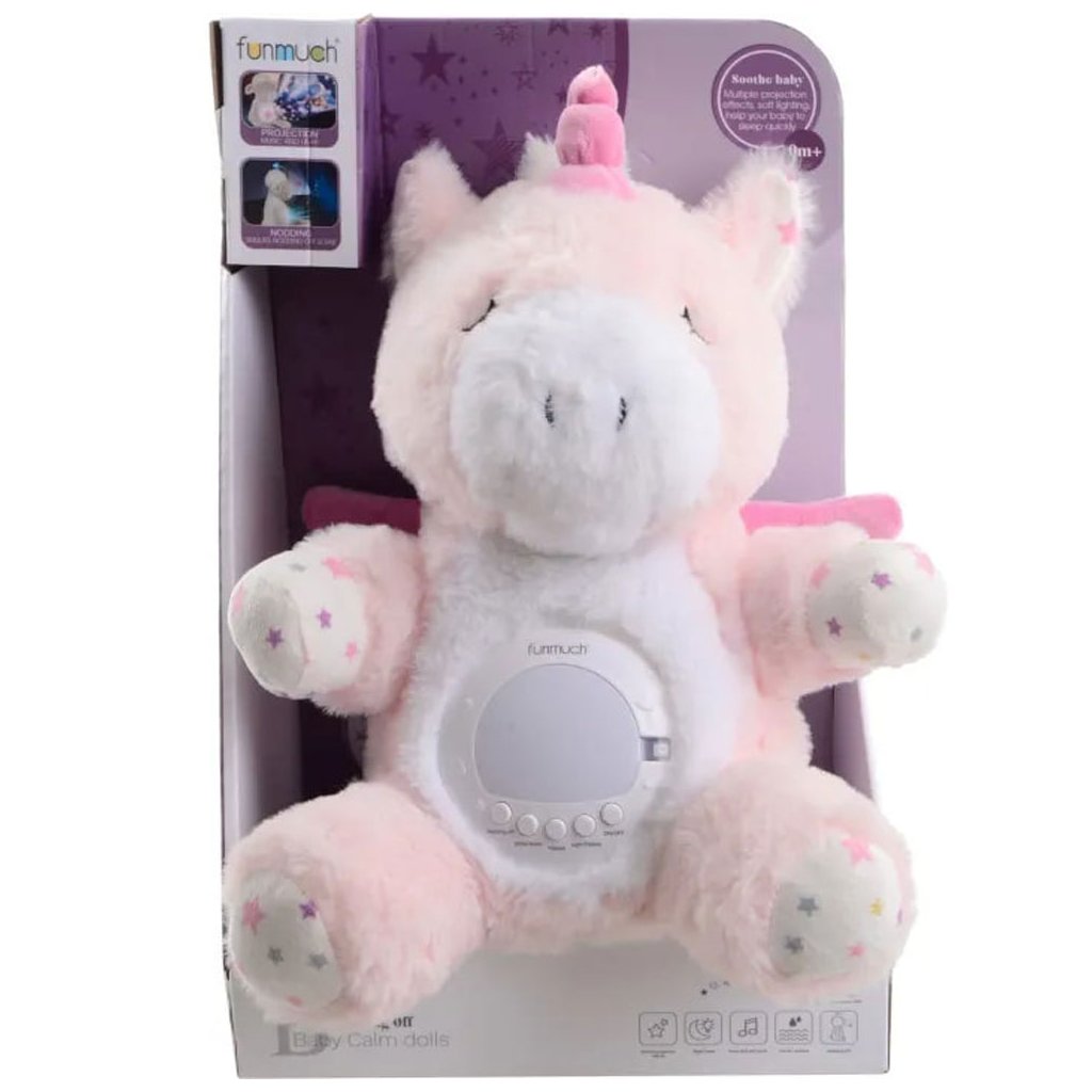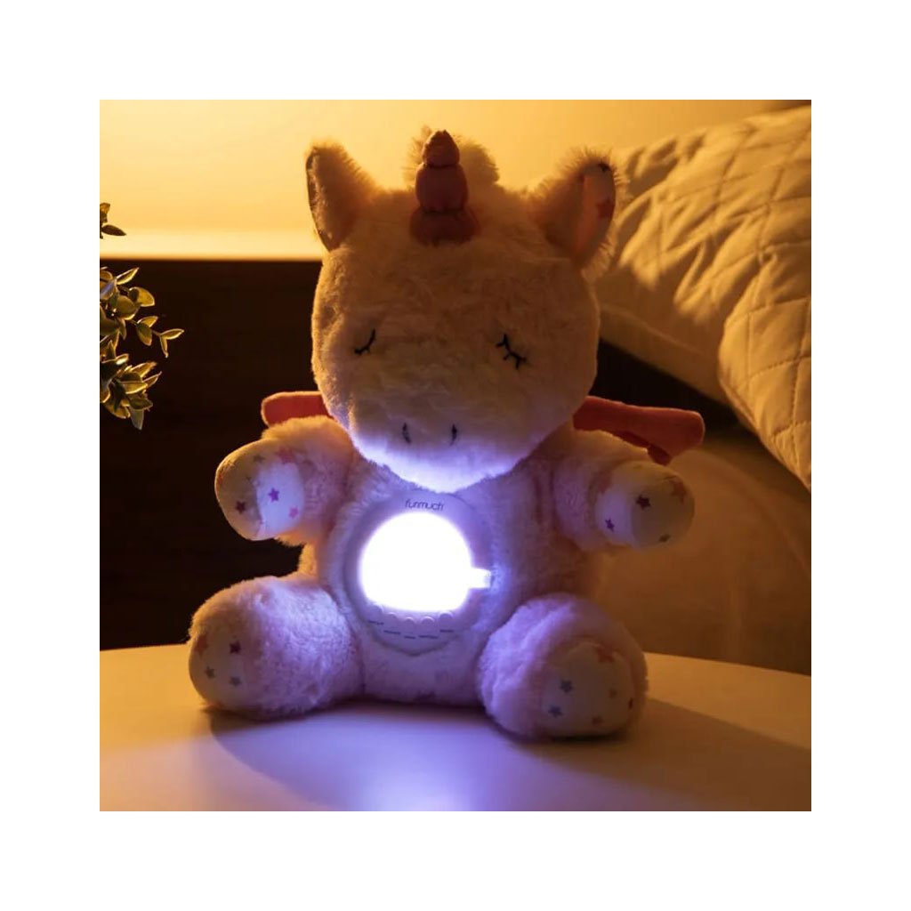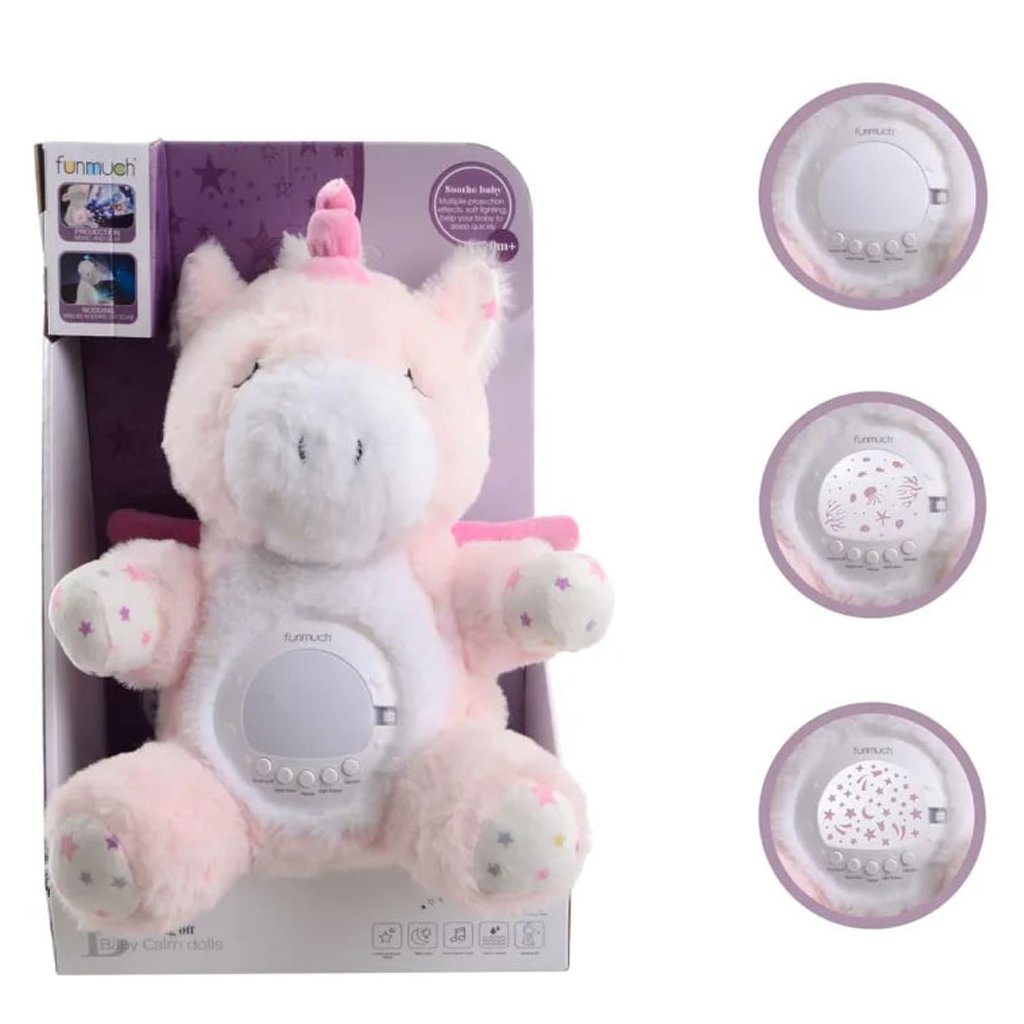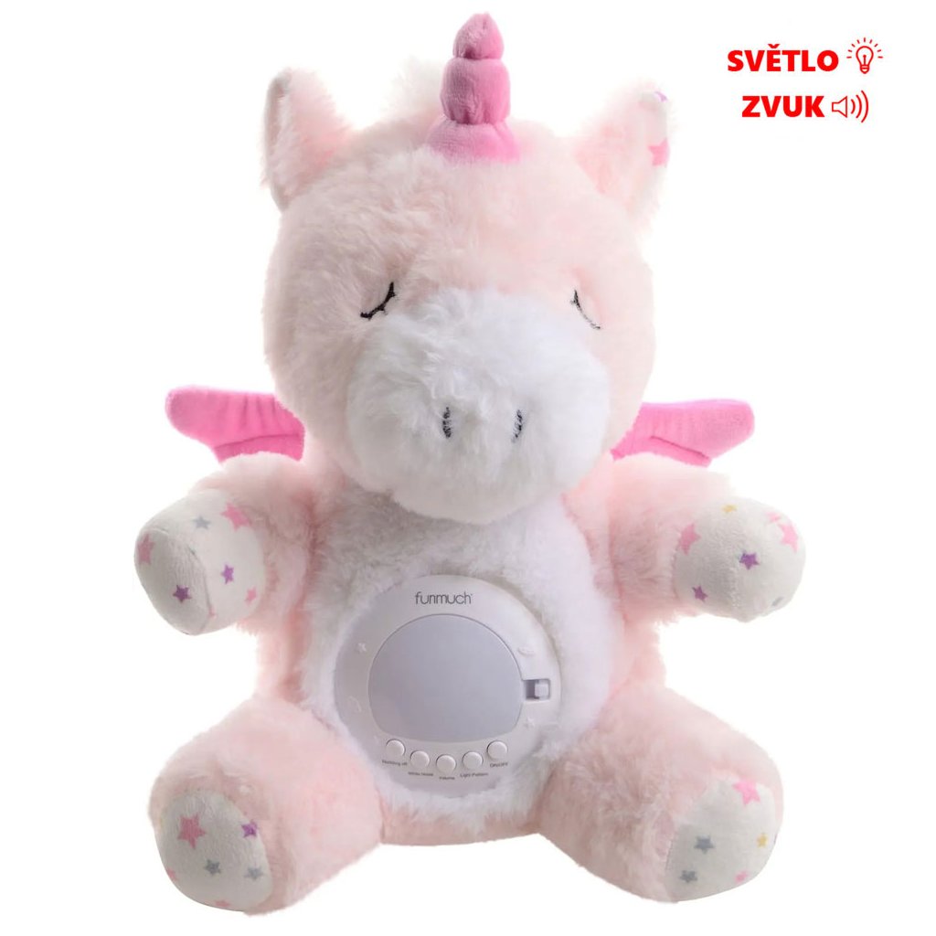 Světla mění barvu a ukazují hvězdy, měsíc a planety. Celou akci doprovází uklidňující, relaxační hudba se zvuky přírody v pozadí. Hračka má několik různých ukolébavek. Hudební box přehrává ukolébavky nepřetržitě téměř 20 minut, takže vaše dítě má čas krásně usnout, aniž byste museli ukolébavky znovu zapínat a riskovat, že se vaše děťátko vzbudí. Když děťátko usne, lze ukolébavky vypnout pomocí tlačítka na bříšku. jednorožec má dvě úrovně hlasitosti, takže jej lze dokonale přizpůsobit potřebám dítěte.