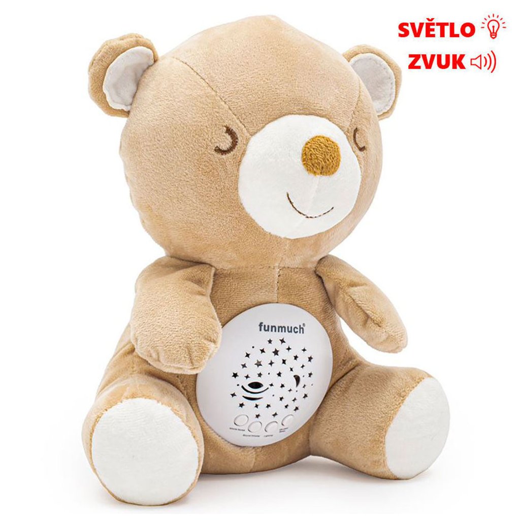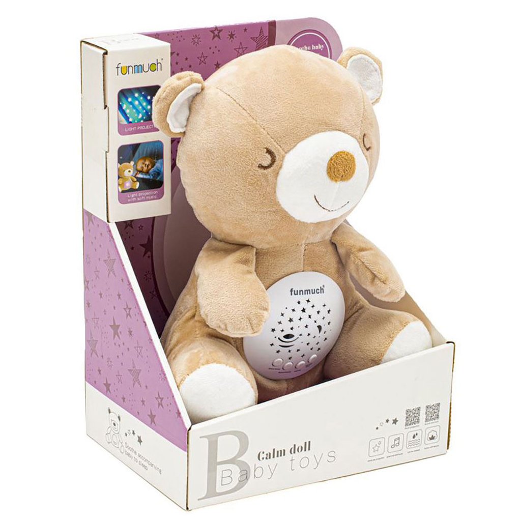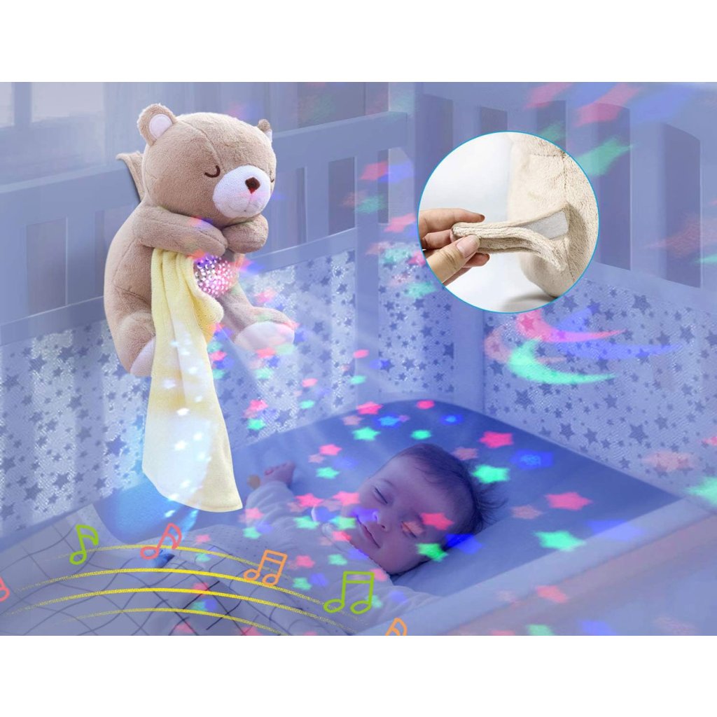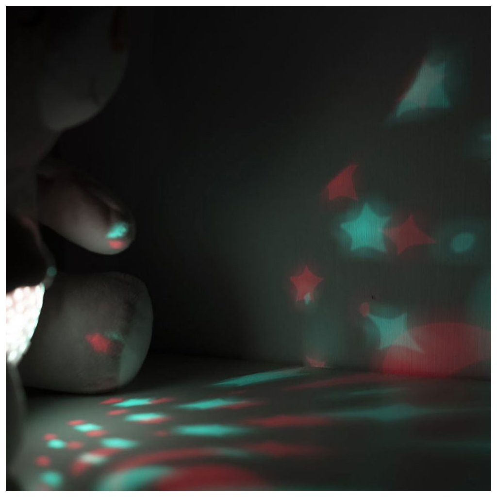 Světla mění barvu a ukazují hvězdy, měsíc a planety. Celou akci doprovází uklidňující, relaxační hudba se zvuky přírody v pozadí. Hračka má několik různých ukolébavek. Hudební box přehrává ukolébavky nepřetržitě téměř 20 minut, takže vaše dítě má čas krásně usnout, aniž byste museli ukolébavky znovu zapínat a riskovat, že se vaše děťátko vzbudí. Když děťátko usne, lze ukolébavky vypnout pomocí tlačítka na bříšku. Medvídek má dvě úrovně hlasitosti, takže jej lze dokonale přizpůsobit potřebám dítěte.