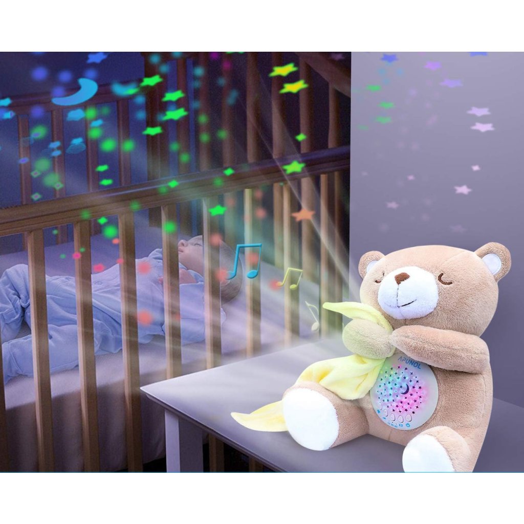 Plyšový medvídek na spaní bude milým společníkem pro vaše děťátko. Maskot je ideální pro miminka a starší děti, které nerady usínají samy. Medvídek bude dokonalým strážcem dobrých snů a zabijákem skříňových příšer. Plyšová hračka má funkci projektoru, který během spánku vytváří klidnou auru.