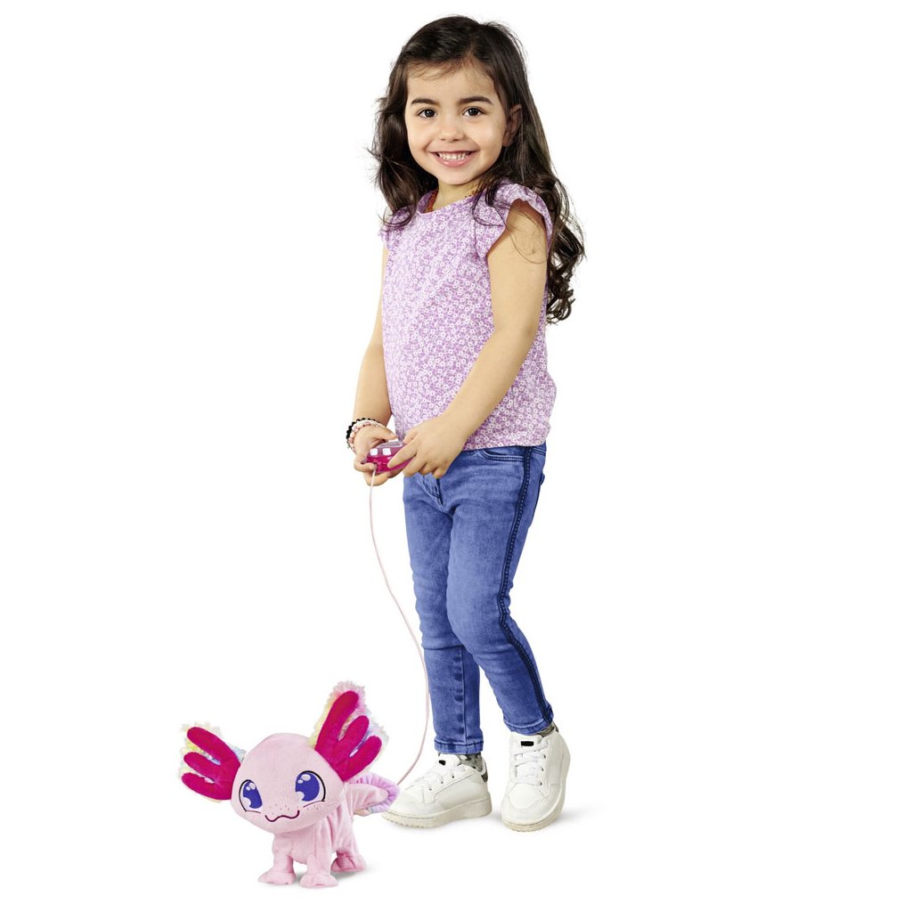 Axolotl má růžovou srst jako skutečné zvíře. Má velké vyšívané oči. Na uších má plyšovou srst, která zpříjemňuje hlazení zvířátka. Lze ho ovládat dálkovým ovladačem. Umí chodit, otáčet hlavou a vrtět ocasem.