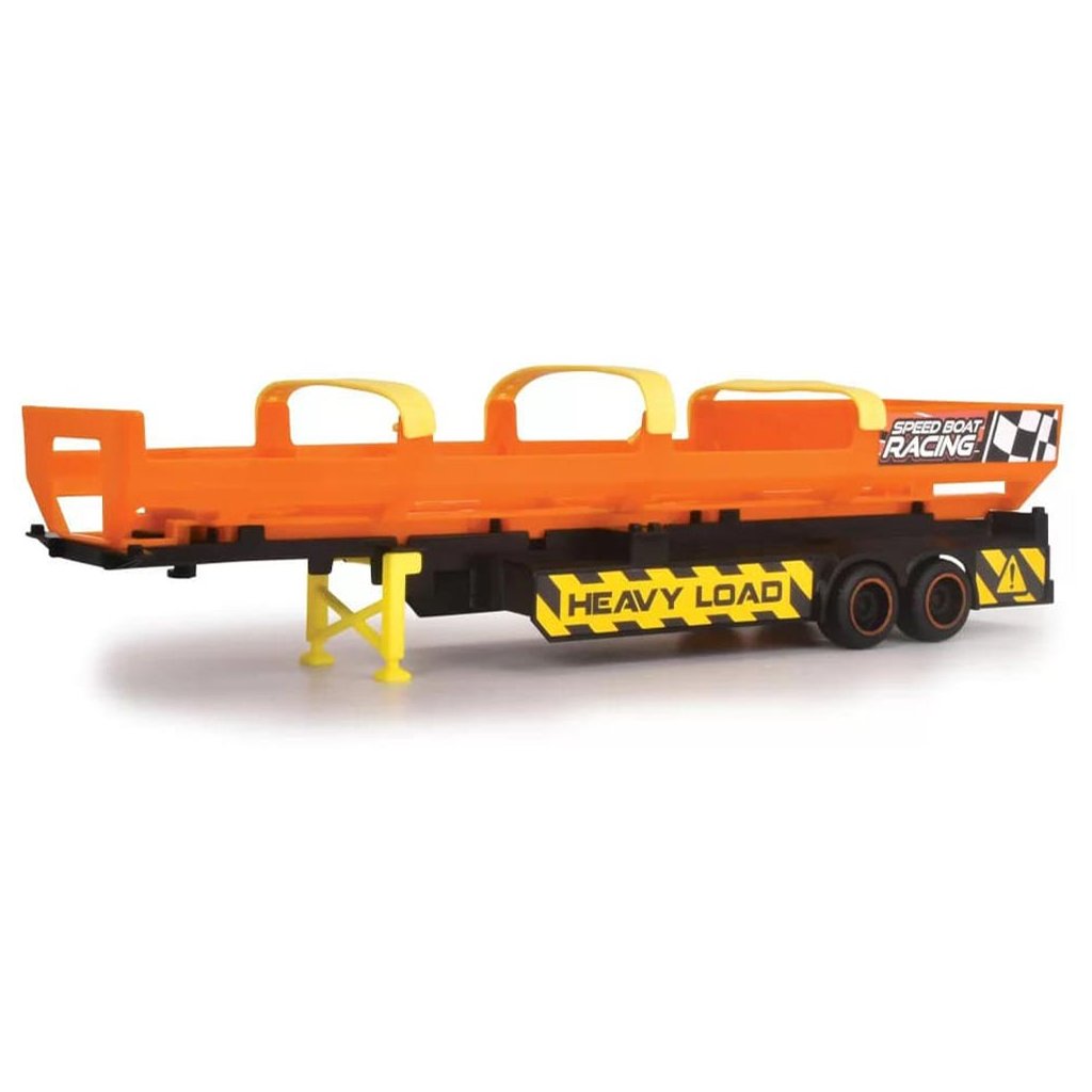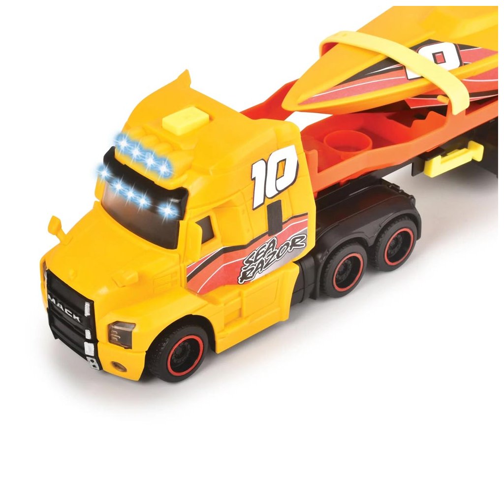 Nákladní auto s funkcí tažného vozidla na přepravu člunů. Dopravený člun spusť na vodu, zapni motor a plav. Autíčko má průhledné čelní sklo, které ti umožňuje vidět interiér kamionu. Má světelnou a zvukovou funkci.
