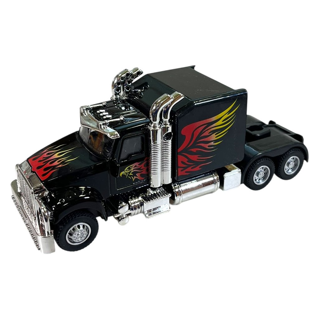 Parádní plastový tahač se světelnými a zvukovými efekty. Tahač jezdí na zpětný chod a je dlouhý 16 centimetrů.