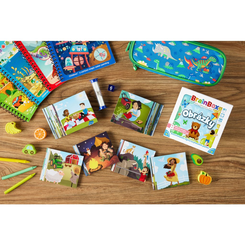 Hra BrainBox Obrázky obsahuje 55 hracích karet s ručně malovanými ilustracemi, které oživují každou scénu, od domácích činností až po sport a přírodu.