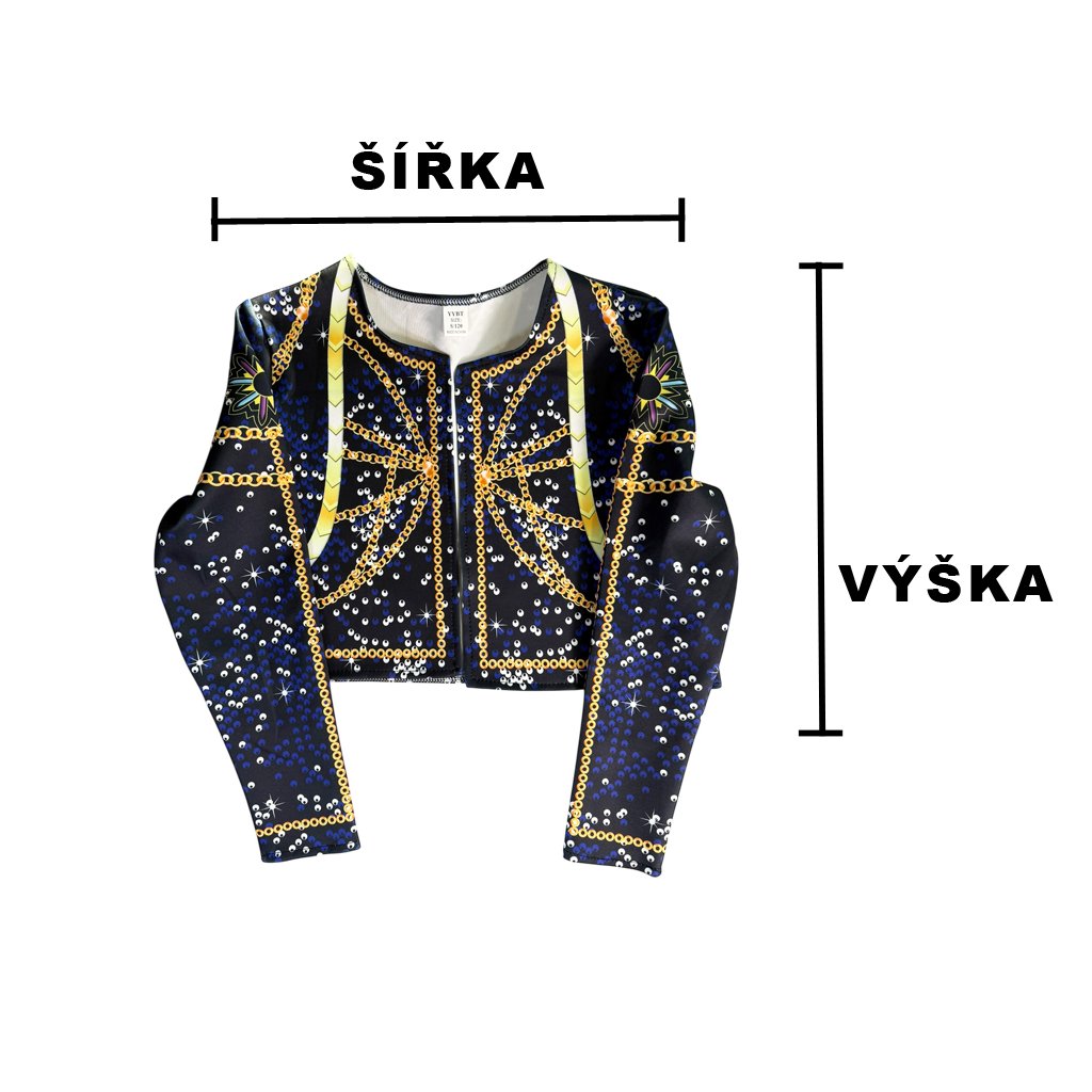 Velikost S: Top šířka 26, výška 30 | Bunda šířka 32, výška 34 | Kraťasy šířka 26, výška 30