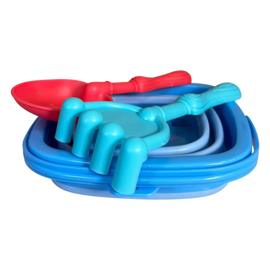 Gumový kyblíček s příslušenstvím na písek. Kyblíček je velké části gumový a díky tomu to můžete složit do plochého tvaru. Sada obsahuje kyblíček, hrabičky a lopatku. Kyblíček je podobně jako krabičky na jídlo z gumy a můžete ho jednoduchým zatlačením složit do plochého tvaru. Je tak ideální na cesty do auta i do letadla.