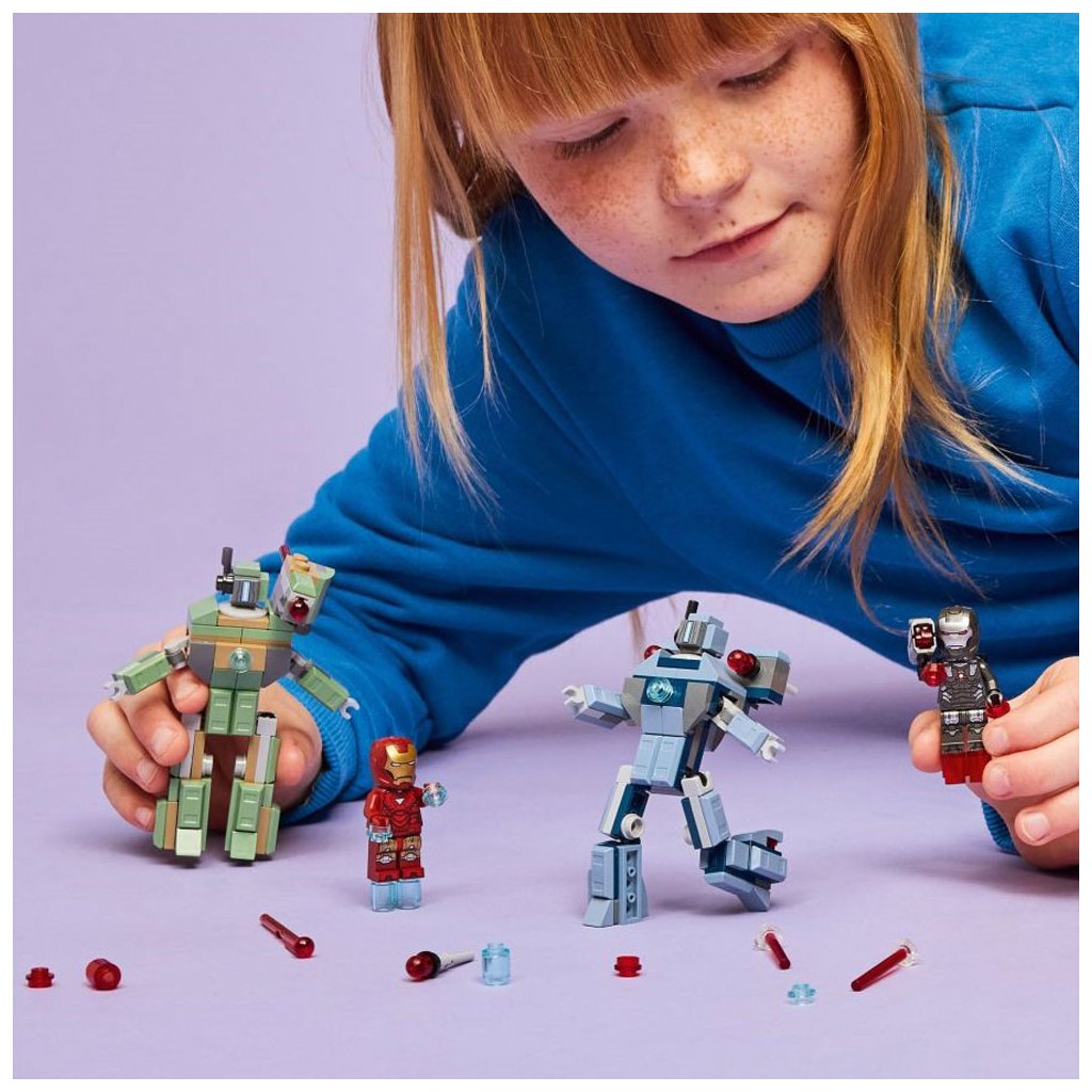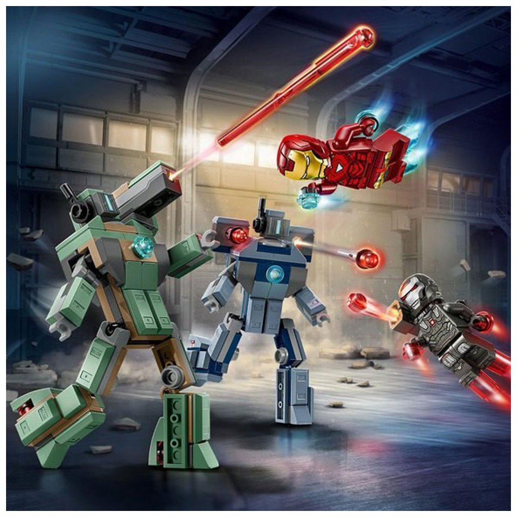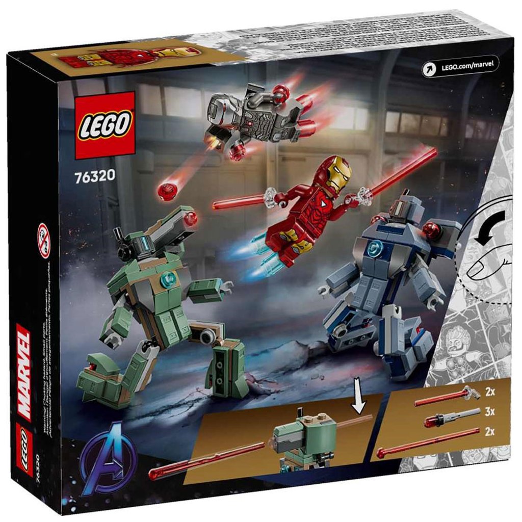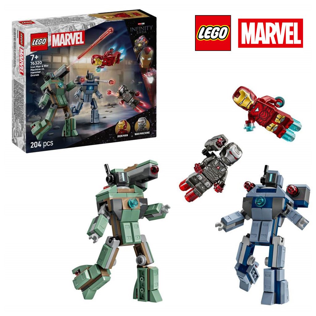Připomeňte si velkolepou bitevní scénu z filmu Iron Man 2 od studia Marvel s touto stavebnicí. Součástí jsou minifigurky Iron Mana a War Machine a 2 sestavitelné Hammerovy Drony. Drony jsou plně pohyblivé, takže je děti můžou napolohovat a užít si s nimi dynamické realistické hraní. Zelený Hammerův Dron má na rameni pružinový vystřelovač. Modrý Hammerův Dron má na obou ramenech vystřelovač aktivovaný stlačením. War Machine má červené blastery na rukou a na nohou a na rameni vystřelovač. Iron Man má modré blastery na rukou a nohou a může držet dílky v podobě laserového paprsku. Pro ještě větší digitální zábavu můžou stavitelé přibližovat a otáčet modely ve 3D a sledovat postup stavění pomocí intuitivní aplikace LEGO Builder. Stavebnice obsahuje 204 dílků.