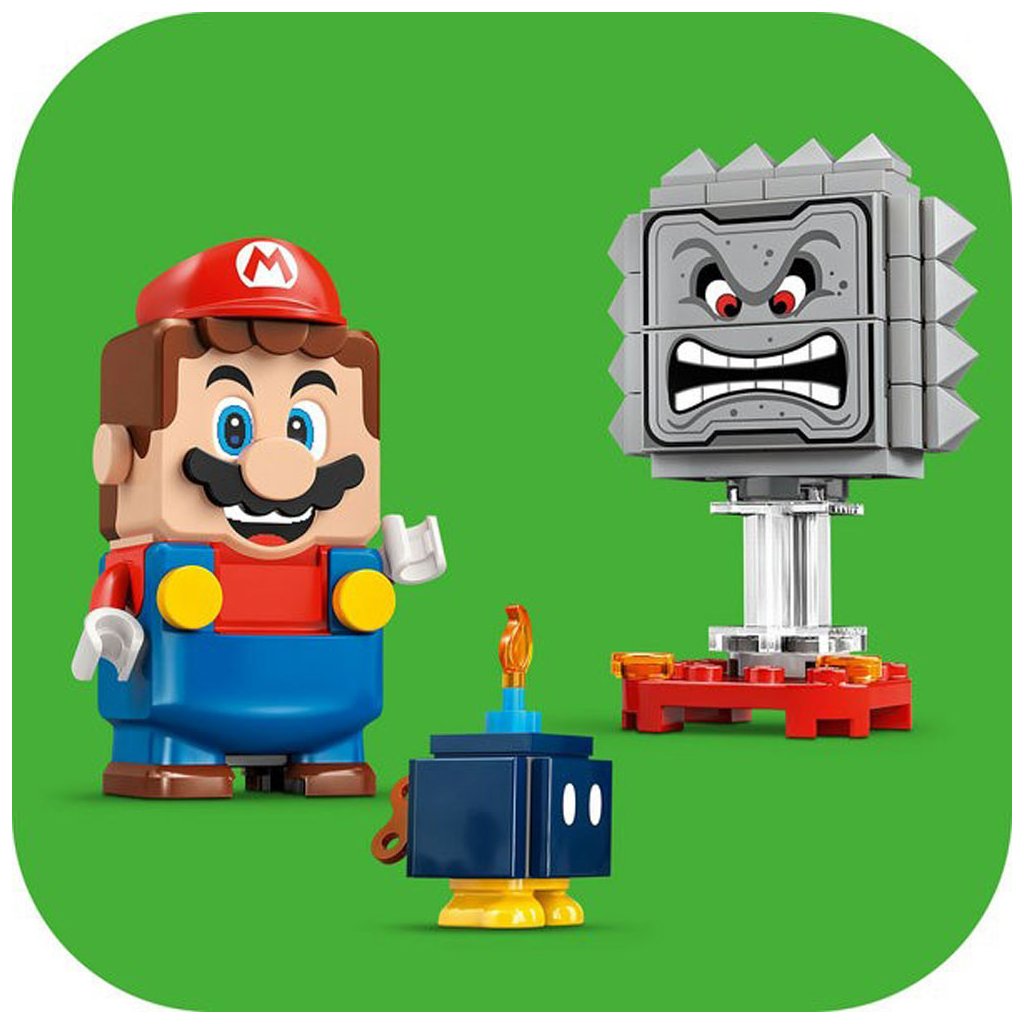 - 3 figurky LEGO® Super Mario™ – Interaktivní figurka LEGO® Mario™, figurkaBob-omba a Thwompa a prvek Banana s obličejem