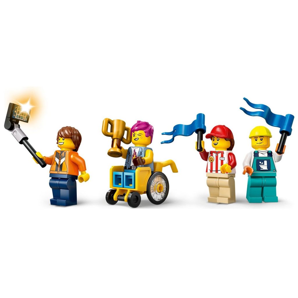 - Doplňky pro minifigurky LEGO® – Tato stavebnice závodních minikár obsahuje řadu doplňků, včetně kolečkového křesla, trofeje pro vítěze, selfie tyče a skříňky s nářadím pro mechanika