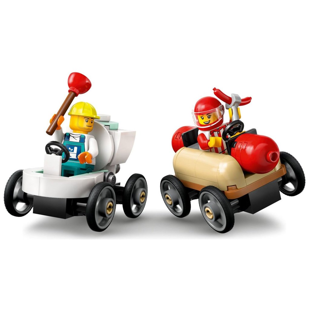 Tato dynamická závodní stavebnice obsahuje rampu pro autíčka a 2 jedinečné závodní minikáry. Sledujte, jak děti umístí vtipné vozidlo v podobě párku v rohlíku a záchodu na vrchol rampy a zatlačením páky je vymrští ze startovní čáry. Součástí stavebnice jsou 4 minifigurky řidičů, včetně prodavače párků v rohlíku a instalatéra, které děti inspirují k nápaditému hraní a vyprávění příběhů.