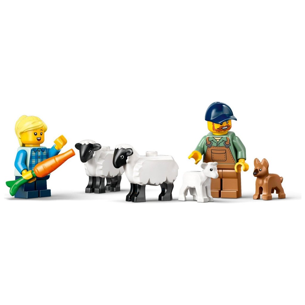- Co najdete v krabici? – Tato farmářská stavebnice obsahuje vše, co děti potřebují k sestavení traktoru, přívěsu, 2 minifigurky, 2 figurky ovcí, figurku jehňátka a figurku štěněte