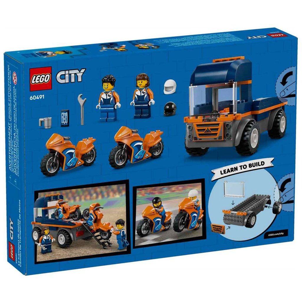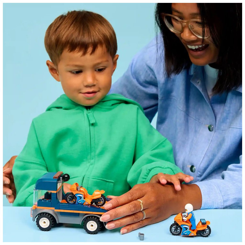 Děti můžou pomocí rampy nakládat a vykládat motorky, hrát si na strhující moto závody s minifigurku usazenou v kabině a užít si zábavná dobrodružství na silnici. Součástí této stavebnice je začátečnická kostka LEGO pro snadné stavění, jednoduché obrázkové pokyny a 3D návod v aplikaci LEGO Builder, která obsahuje nástroje přibližování a otáčení, aby si děti mohly během stavění prohlížet modely ze všech úhlů. Stavebnice představuje zábavný dárek k narozeninám nebo jakékoli jiné příležitosti pro děti, které milují závodění, nápadité hraní a vymýšlení příběhů. Zkombinujte ji s dalšími stavebnicemi z řady LEGO City (prodávají se samostatně) a zažijte ještě více napínavých závodů. Stavebnice obsahuje 88 dílků.