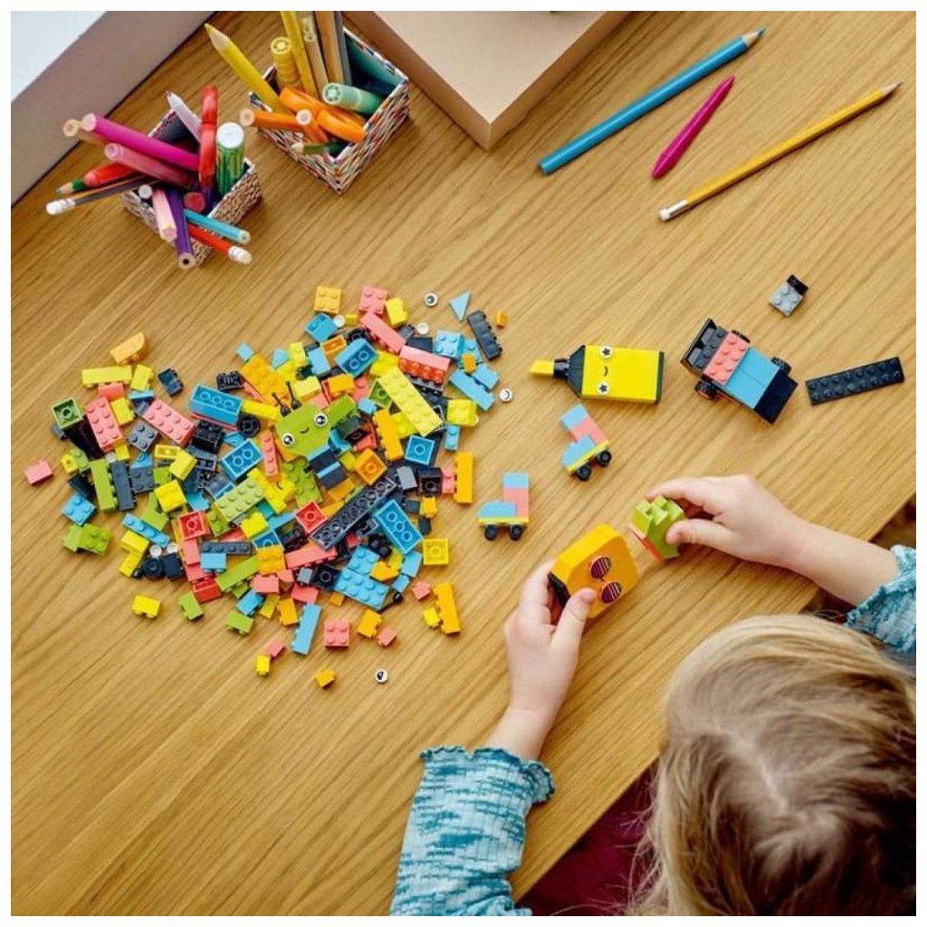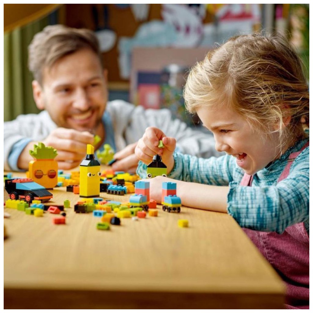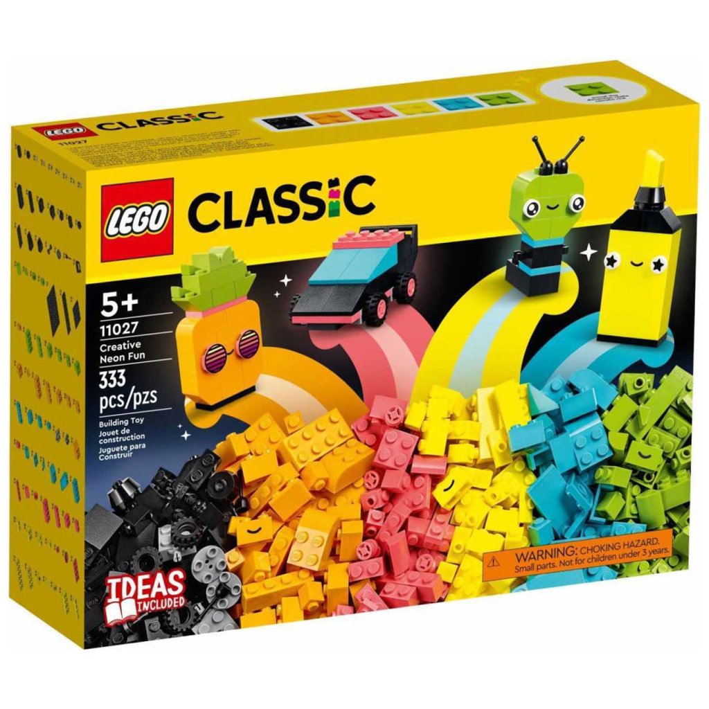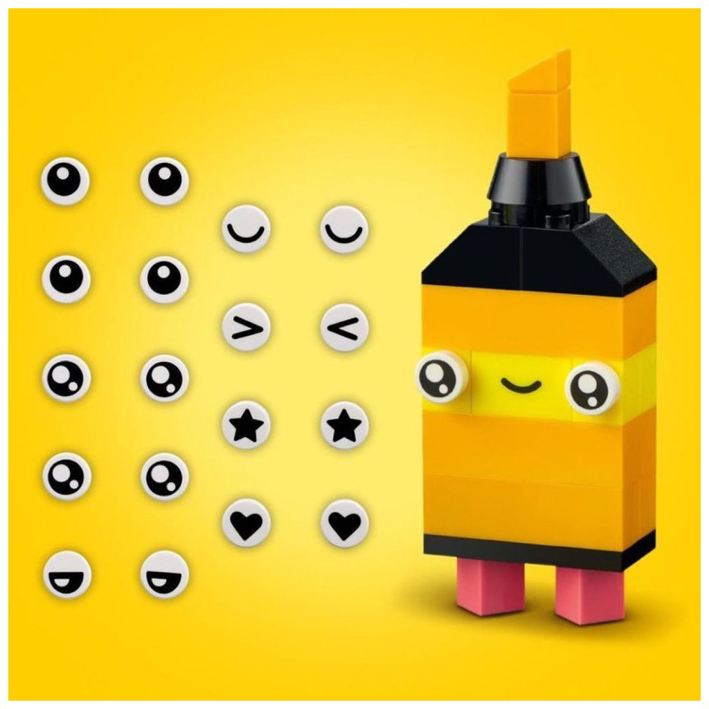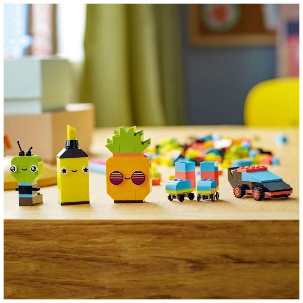 Tato všestranná stavebnice obsahuje 333 kostek různých velikostí v neonových barvách. 18 kostek zdobí oči, kterými děti vdechnou svým výtvorům život. Nechybí tištěný návod na sestavení 5 zábavných modelů – ananasu, zvýrazňovače, auta, mimozemšťana a bruslí. Ty poskytnou dětem tvůrčí sebedůvěru, kterou pak využijí k stavění čehokoli, co je jen napadne! Digitální verzi návodu na stavění najdete také v aplikaci LEGO Builder.