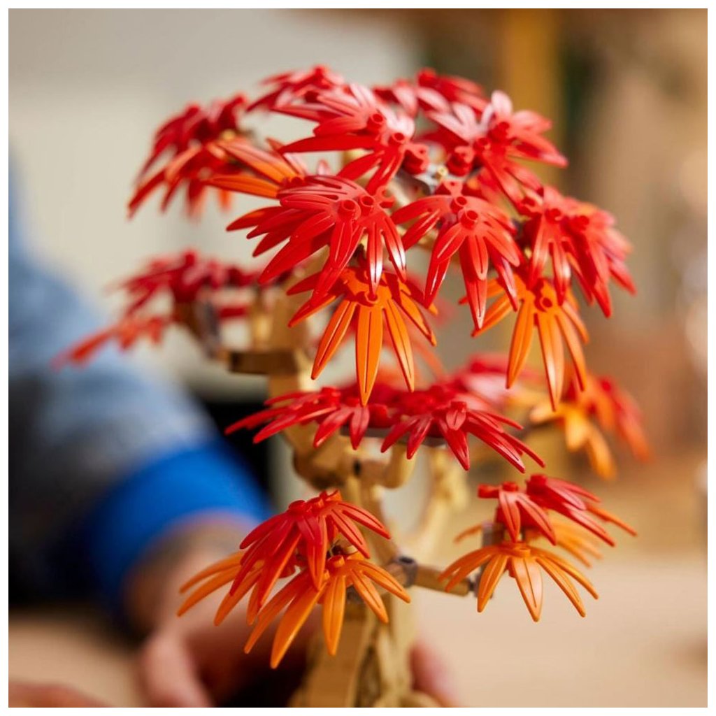 Tato rostlina z kostek LEGO zachycuje krásu a barevnost skutečných bonsají červených javorů. Má červené a oranžové listy a je zasazena v tmavě zeleném květináči. Oddechněte si při skládání rostliny, kterou si pak hrdě vystavíte jako dekoraci doma nebo v kanceláři, kam vnese nádech klidu a míru.
