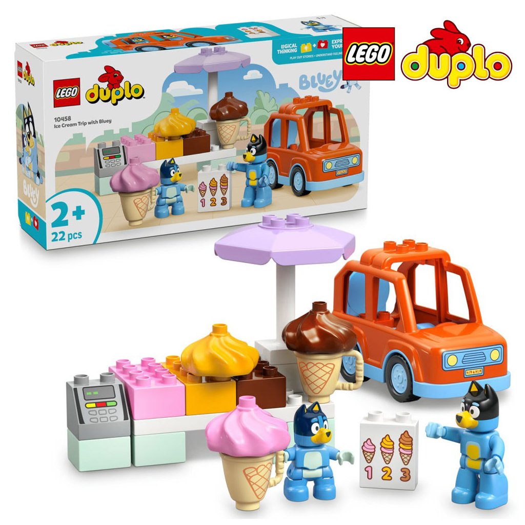 Batolata procvičí svou dovednost poznávání čísel tím, že si vyberou, kolik kopečků zmrzliny chtějí, a naskládají na sebe správný počet kostek. Začnou také třídit barvy při nabírání příchutí a procvičí si jemnou motoriku při umisťování zmrzliny na kornouty. Stavebnice LEGO DUPLO Bluey umožňují malým dětem a jejich rodinám přehrávat si každodenní činnosti a přemýšlet, jak se při těchto činnostech cítí. Stavebnice obsahuje 22 dílků.