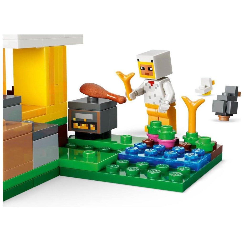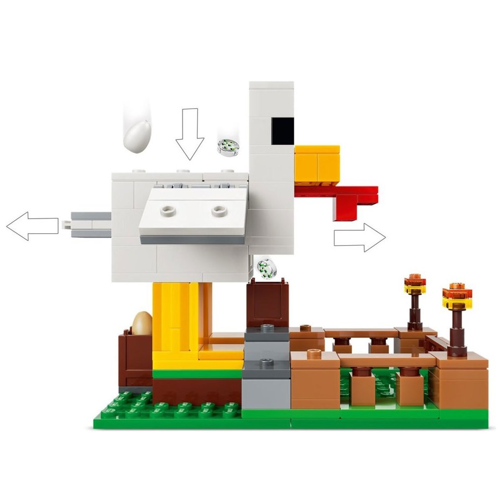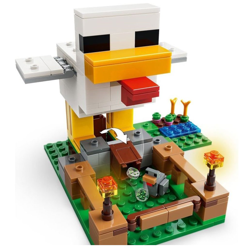 Model kurníku má tvar slepice, pohyblivá křídla a v přední části nechybí výběh s otevírací bránou. Obří slepice snáší vejce v zadní části a ze zobáku se jí sypou semínka do nádoby, která se naklání dopředu, aby se malé slepice mohly nakrmit. Mezi zábavné doplňky patří pochodně, seno, udírna, 2 vejce, 2 balíčky semínek, kuřecí stehno, pírko a sekera. Stavebnice představuje skvělý dárek pro hráče Minecraftu, stavitele LEGO a fanoušky herních dekorativních modelů. Součástí je aplikace LEGO Builder, která dětem umožňuje přibližovat a otáčet modely ve 3D a sledovat postup stavění pomocí srozumitelných digitálních návodů. Stavebnice obsahuje 233 dílků.