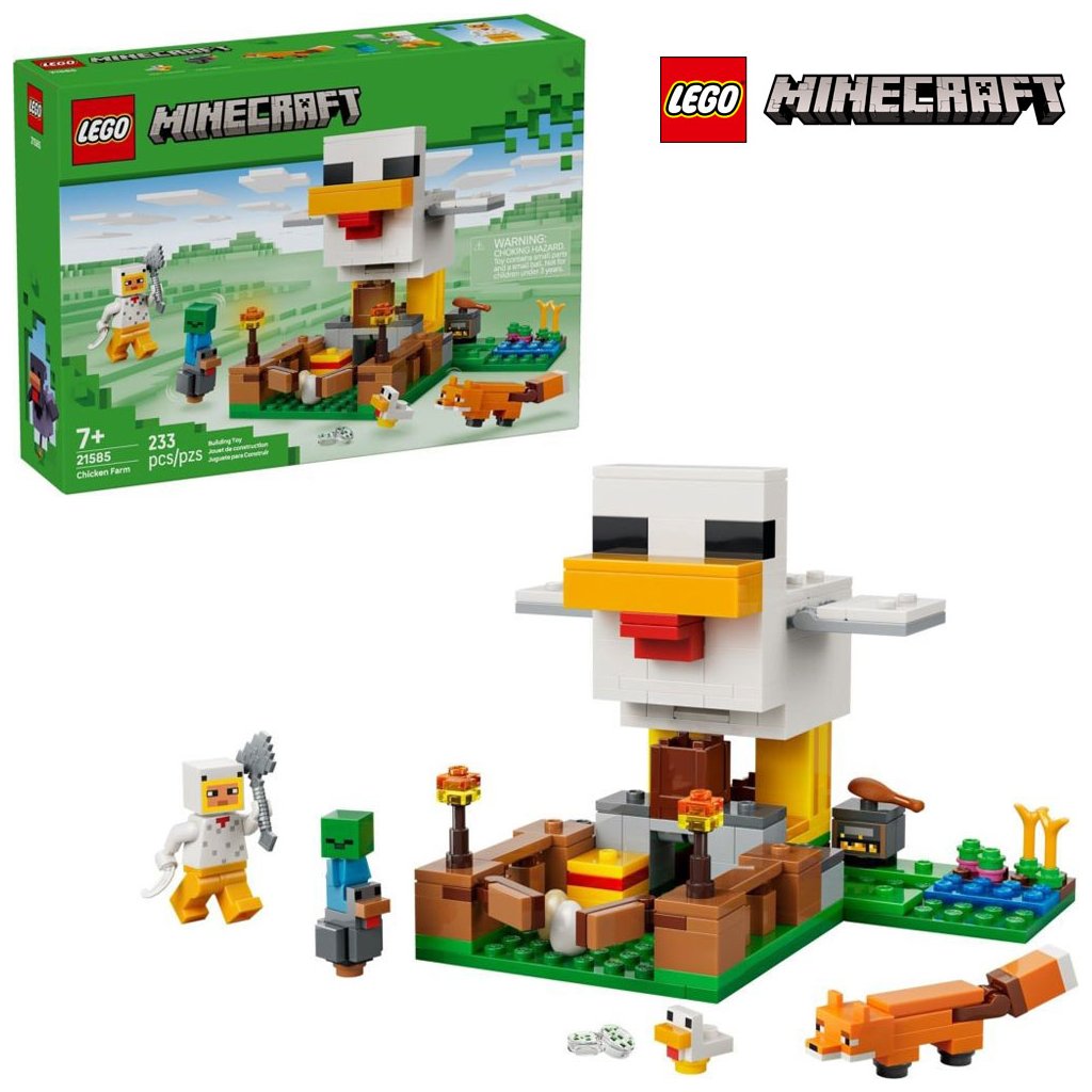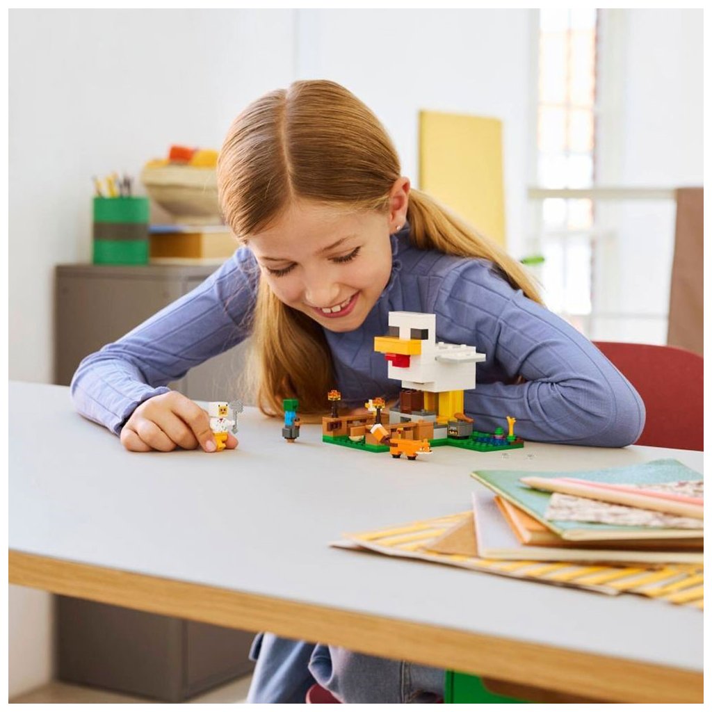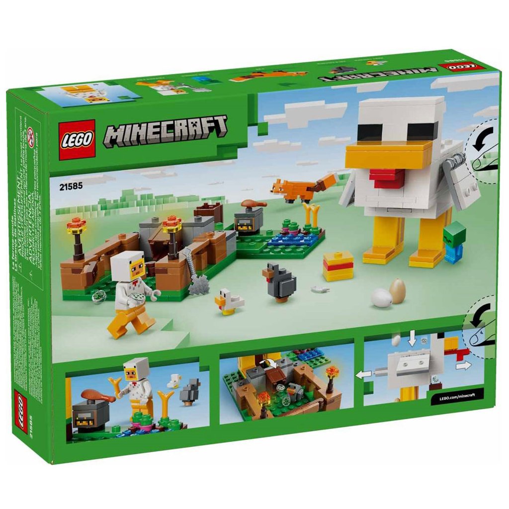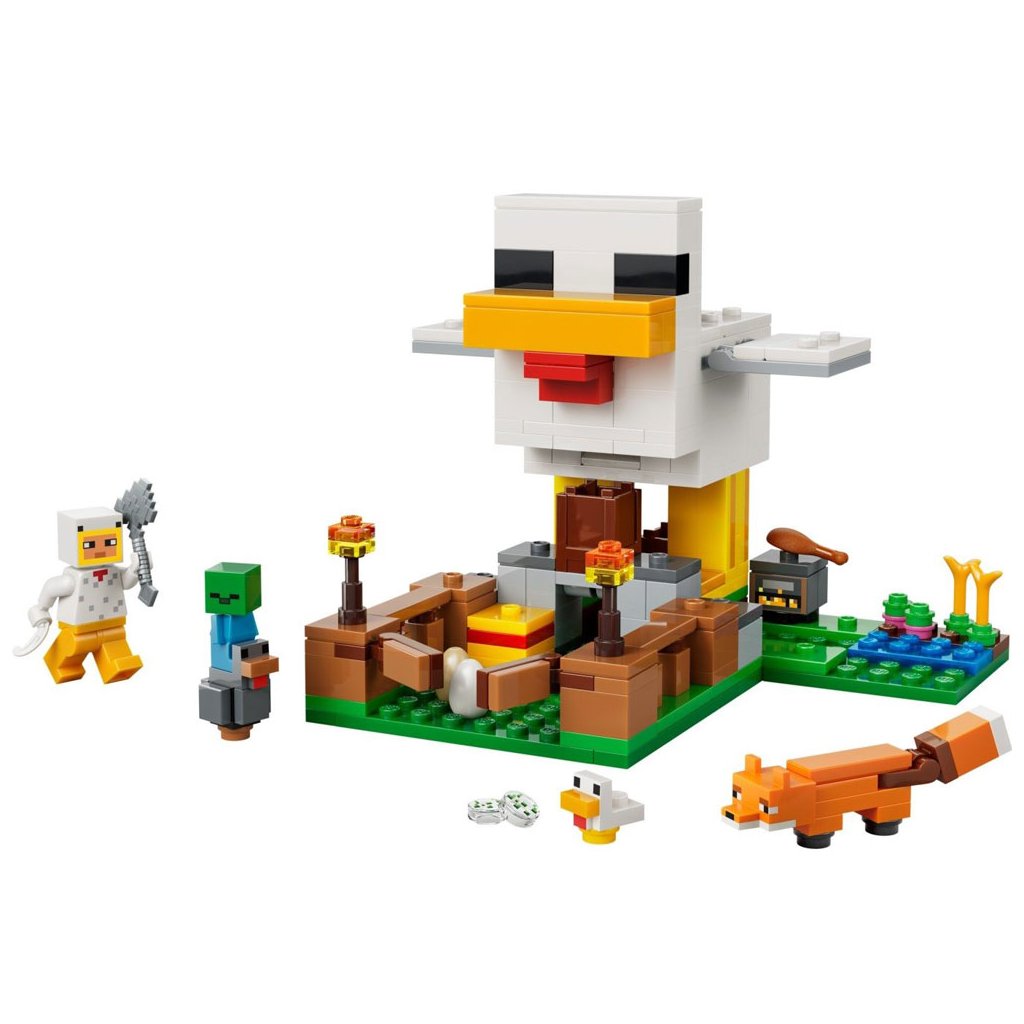 Model kurníku má tvar slepice, pohyblivá křídla a v přední části nechybí výběh s otevírací bránou. Obří slepice snáší vejce v zadní části a ze zobáku se jí sypou semínka do nádoby, která se naklání dopředu, aby se malé slepice mohly nakrmit. Mezi zábavné doplňky patří pochodně, seno, udírna, 2 vejce, 2 balíčky semínek, kuřecí stehno, pírko a sekera. Stavebnice představuje skvělý dárek pro hráče Minecraftu, stavitele LEGO a fanoušky herních dekorativních modelů. Součástí je aplikace LEGO Builder, která dětem umožňuje přibližovat a otáčet modely ve 3D a sledovat postup stavění pomocí srozumitelných digitálních návodů. Stavebnice obsahuje 233 dílků.