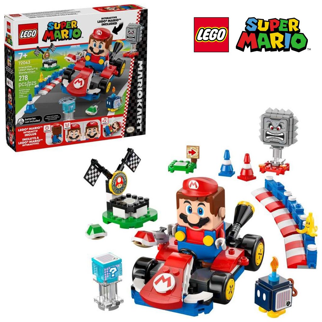 - Interaktivní hračka – Závoďte na motokáře Standard Kart s LEGO® Mariem, získejte digitální odměny z krabice Item Box, porazte Bob-omba a Thwompa, sledujte, jak LEGO Mario™ reaguje na zelené a červené destičky LEGO a mnoho dalšího