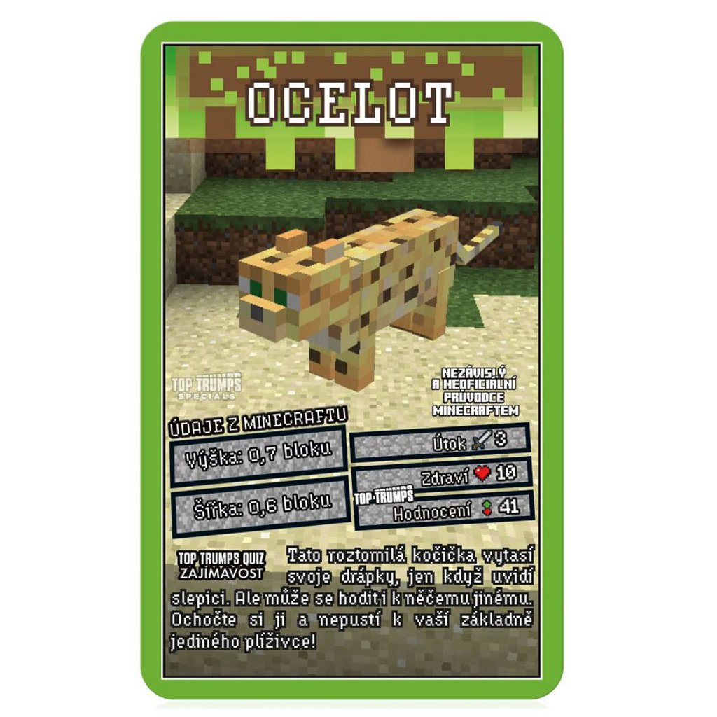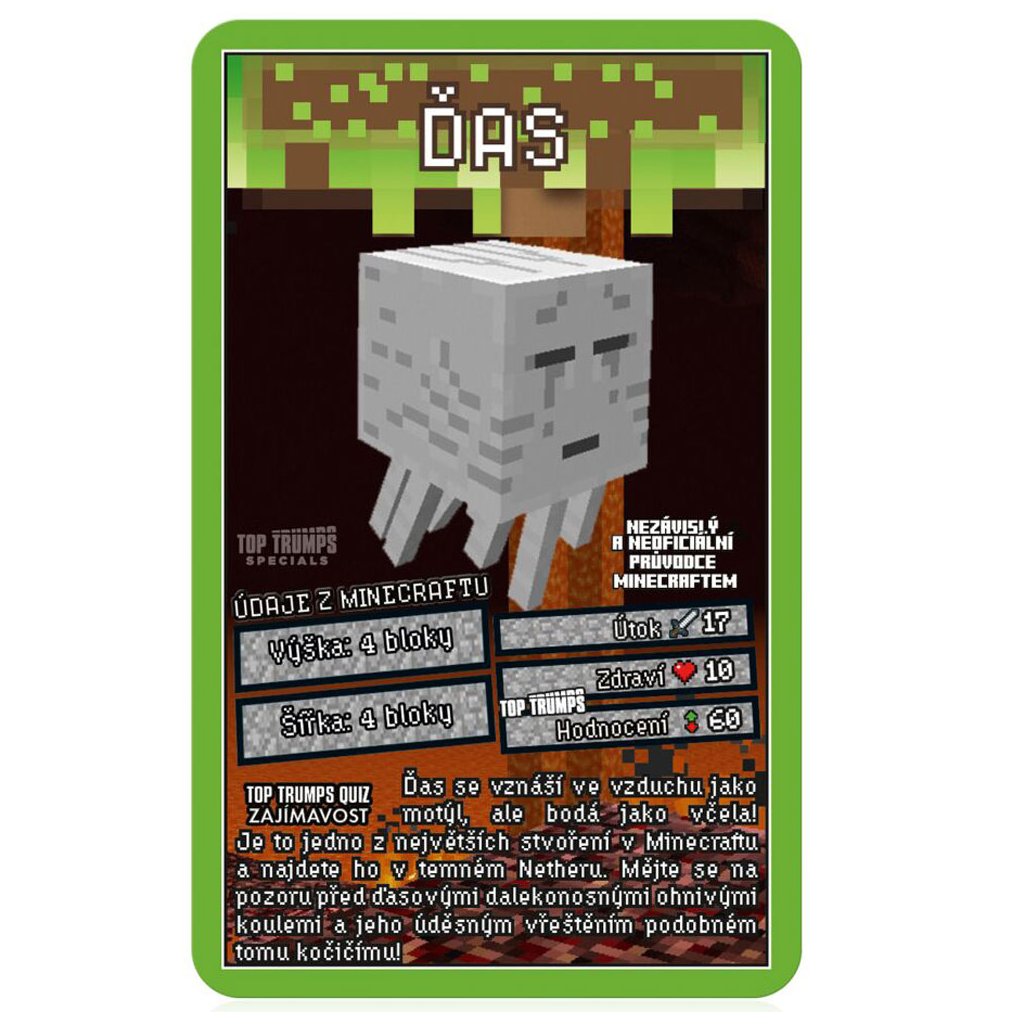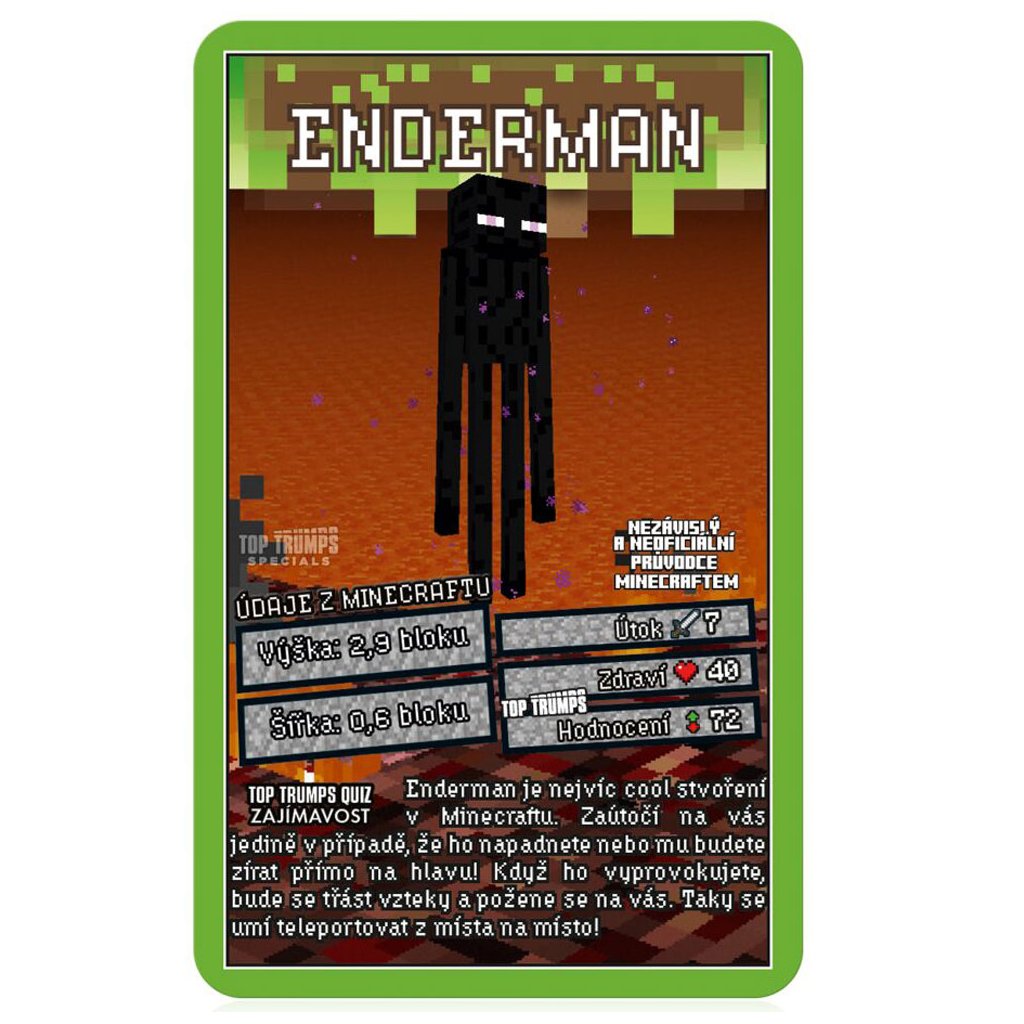 Pokud jste blázen do všech věcí Minecraft, pak si musíte vyzvednout Top Trumps Minecraft. Zábavná vzdělávací karetní hra pro lidi, kteří milují své davy z Minecraftu. Připravte se přechytračit své protivníky, objevujte nová a vzrušující fakta a bojujte.