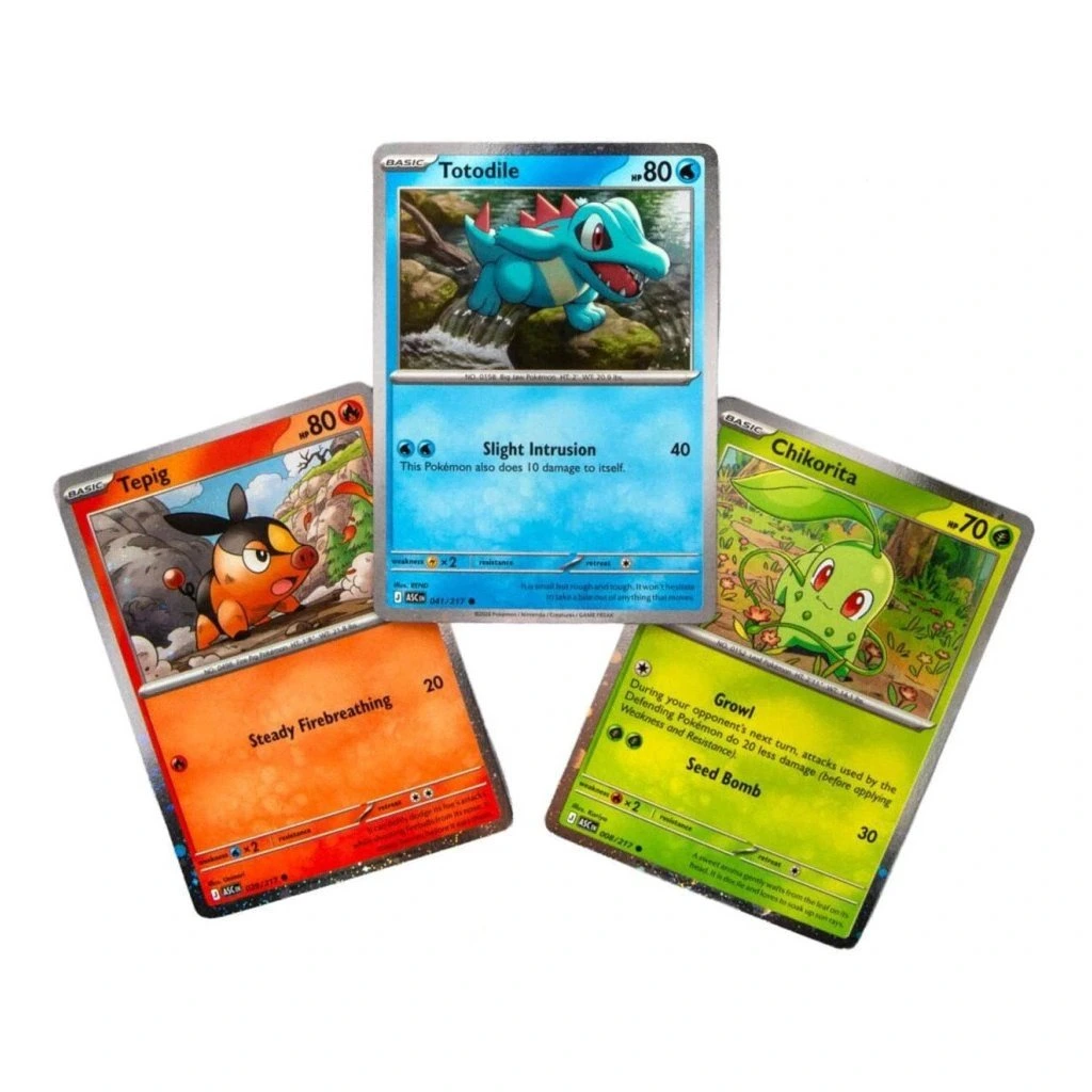 Set tří promo karet z Ascended Heroes Tepig, Totodile a Chikorita ze setu Deluxe Pin Collection.