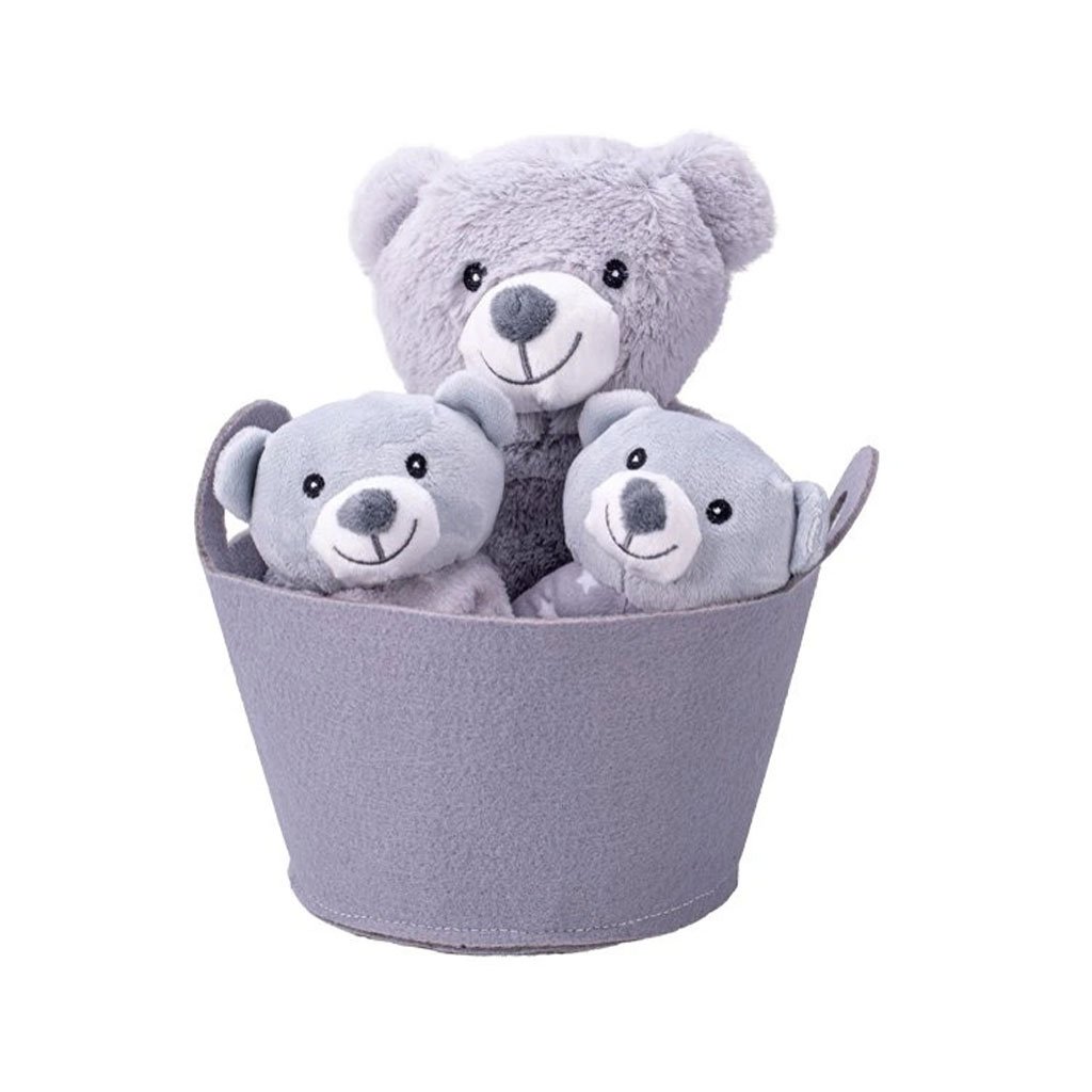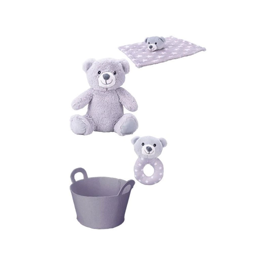V elegantním košíku najdete vše, co vaše děťátko potřebuje pro klidné usínání i veselé hraní – měkoučkého plyšového medvídka, který se stane věrným kamarádem, jemné chrastítko pro rozvoj smyslů a útulný usínáček pro sladké sny.