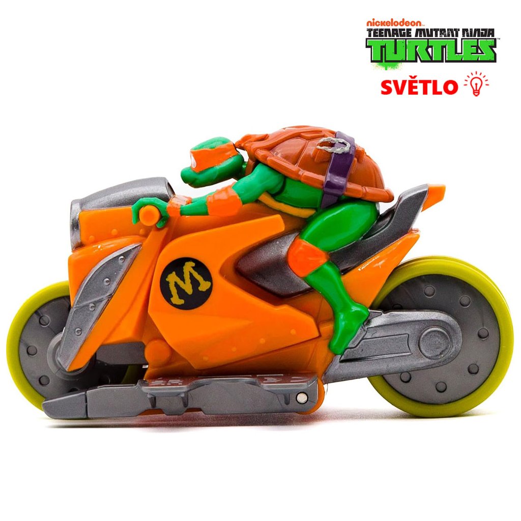 Ninja Želvy přinášejí motorky s figurkou na setrvačník. Po stisknutí tlačítka motorce svítí světlo. Navíc má systém click. Jednoduše zacvakněte rameno motocyklu do správné polohy a rozjeďte ho. Uvolněte a sledujte, jak jezdec předvádí salto vzad přímo před vašima očima!
