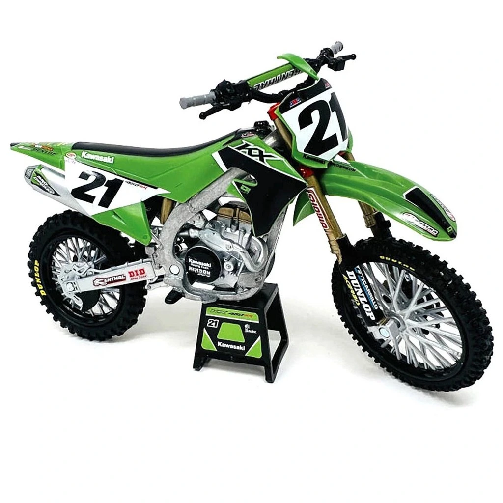 Dokonale propracovaný model motocyklu v měřítku 1/6 NewRay Kawasaki KX-450F Jason Anderson No.21. Oficiální produkt NewRay. Vyrobeno z kovových a plastových dílů. Funkční pohyb řidítek. Pohyblivá gumová kola. Odpružená zadní vidlice. Vystaveno na vlastním středovém stojanu.