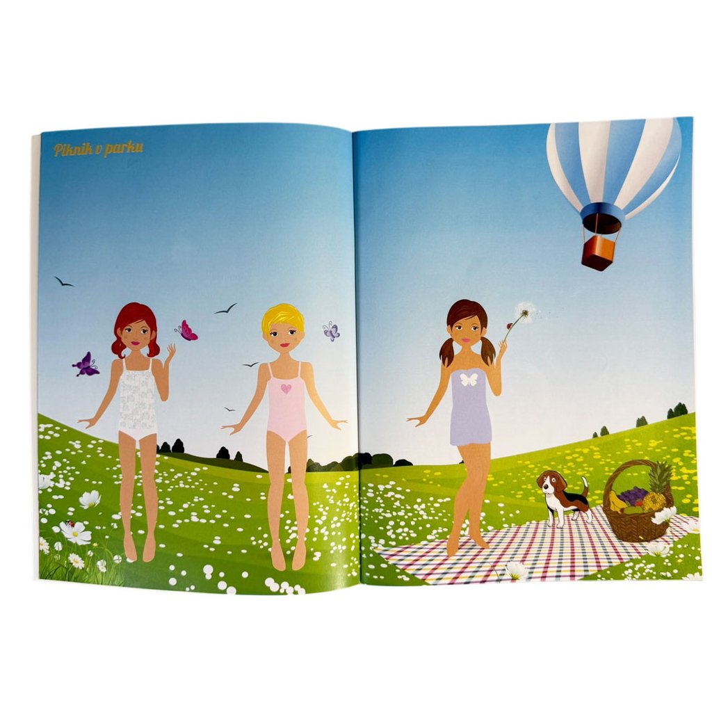 Samolepková knížka obsahuje 24 stran a více než 350 barevných samolepek šatů, bot a doplňků k dolepení a ozdobení.