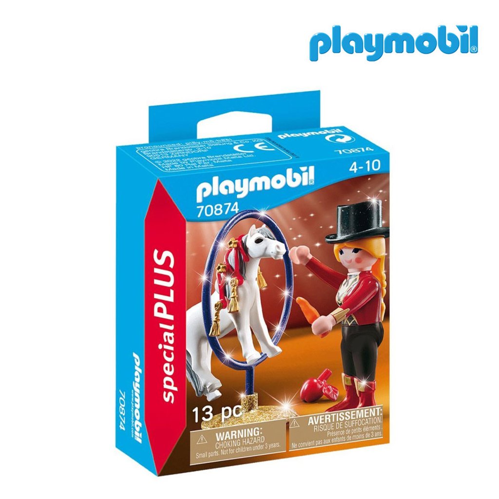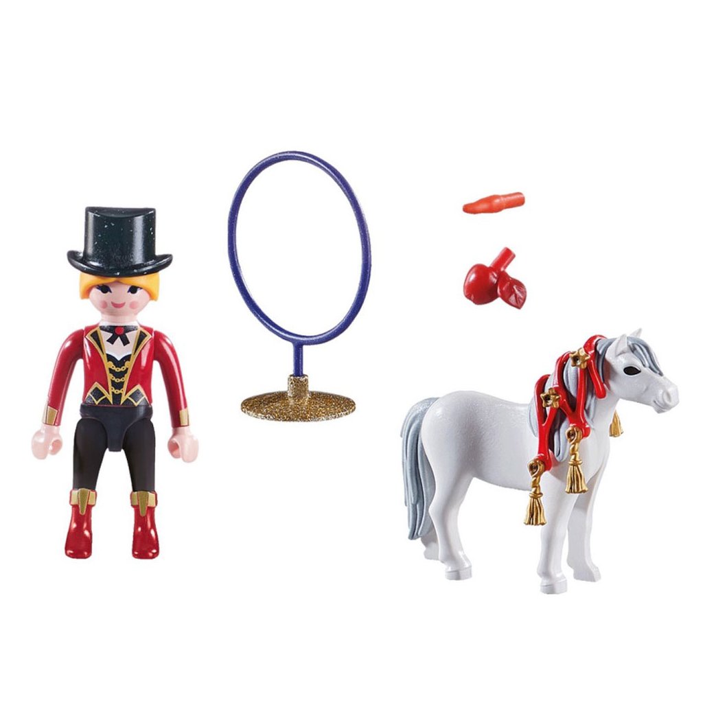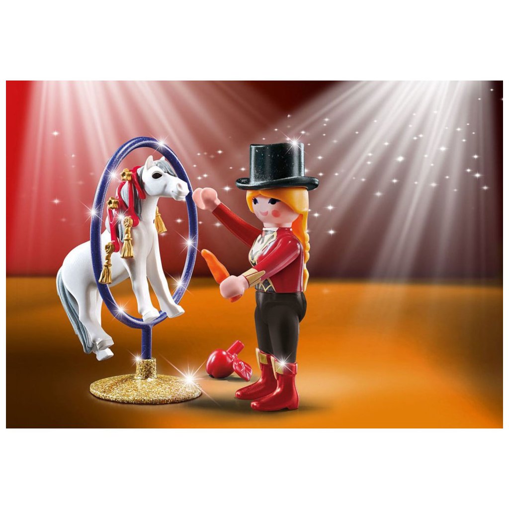 Velká důvěra mezi člověkem a koněm je předpokladem úspěšného výcviku koně. Po mnoho let tito dva každý den pracovali na svém výstavním čísle. Dnes je den velkého představení. Hříva poníka je slavnostně ozdobena a umělec má na sobě elegantní kostým. Závěs nahoru! Figurky PLAYMOBIL Special Plus se skvělými doplňky jsou ideálním dárkem. Skvělá zábava sbírat, hrát a rozdávat!